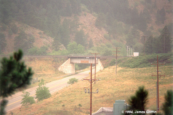A short but familiar bridge to many, this is the one across the mouth of Coal Creek canyon. For many years it carried the Rio Grande sign shown here; around 1995 it was changed to a Southern Pacific meatball, and now it lacks any sign at all. | ||