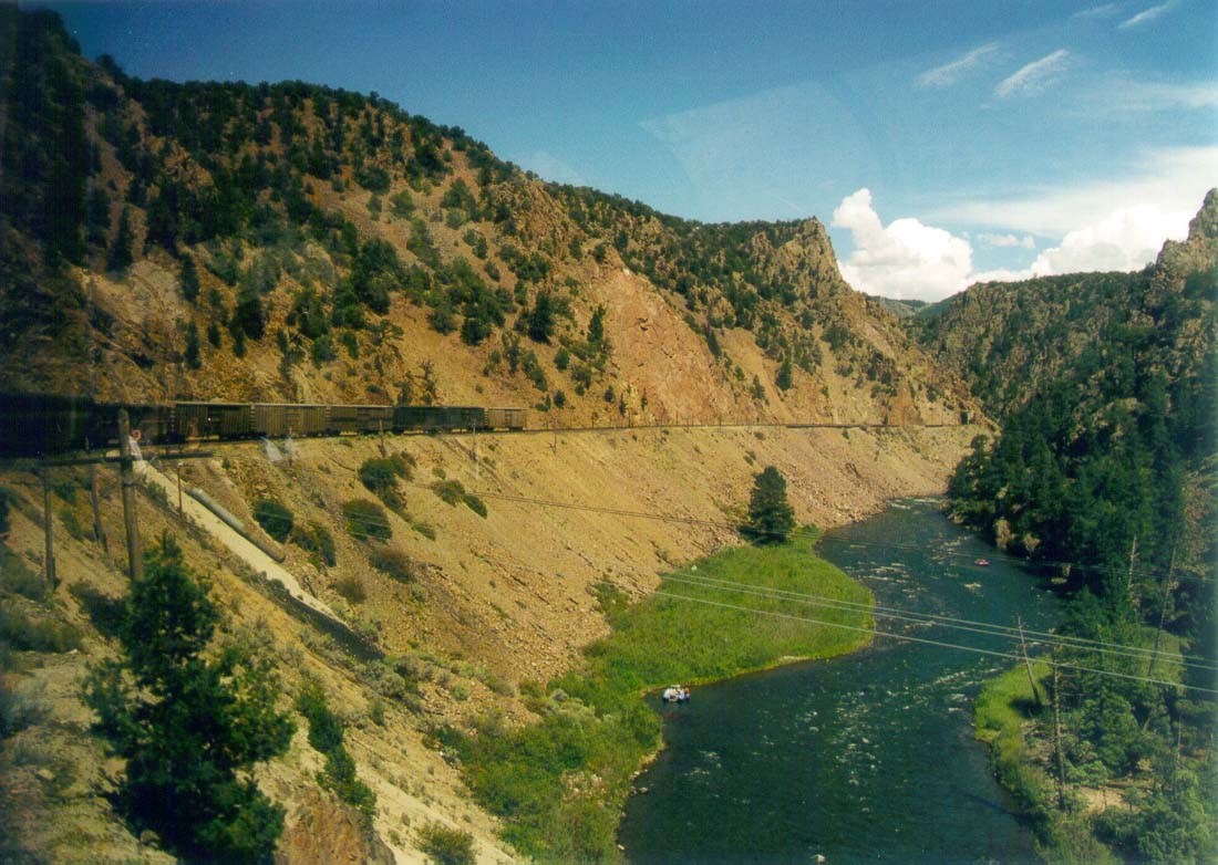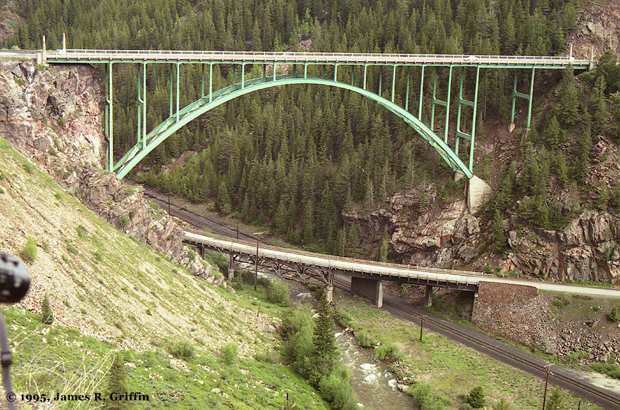 The famous Hanging Bridge in the bottom of the Royal Gorge. It’s an innovative solution to a unique problem: how to carry the alignment through a stretch of canyon too narrow to carve a typical right-of-way? Answer: hang it over the river by anchoring girders in both cliff faces and suspend the bridge under it. | ||