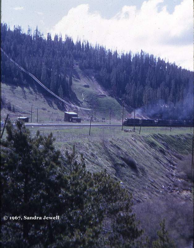 This view from the summer of 1967 shows a string of 4-axle units leading an eastbound train towards Moffat tunnel. There are at least two GP30s on the point. For those who are familiar with the contemporary surroundings, notice the total lack of ski condos in the shot. The valley was overall much more “natural” back then… | ||