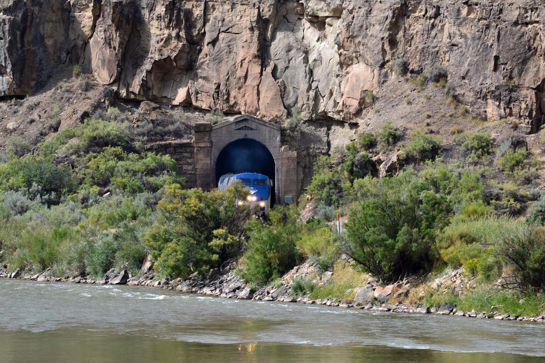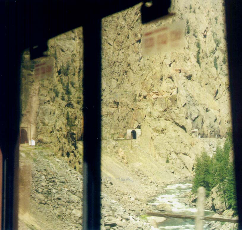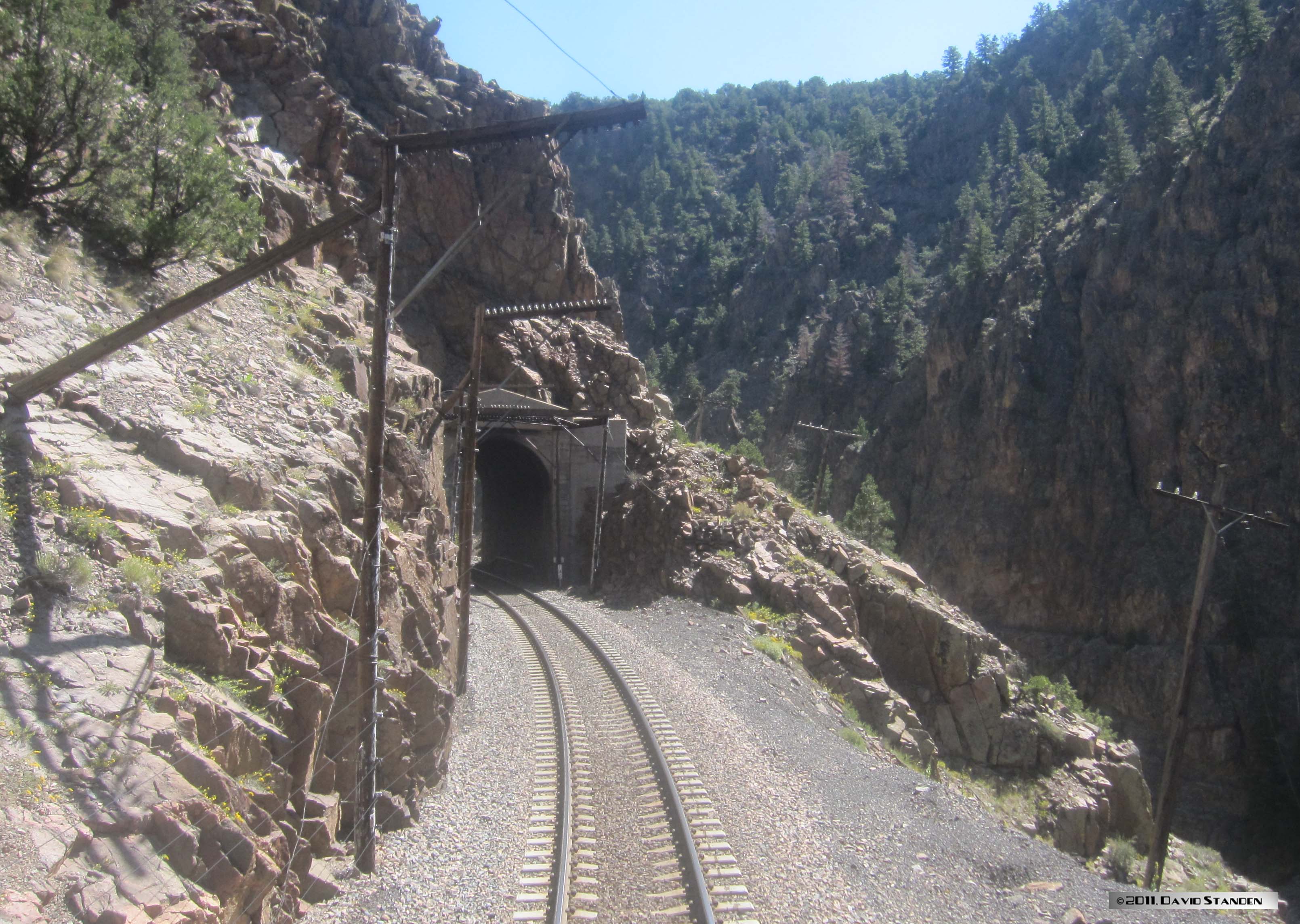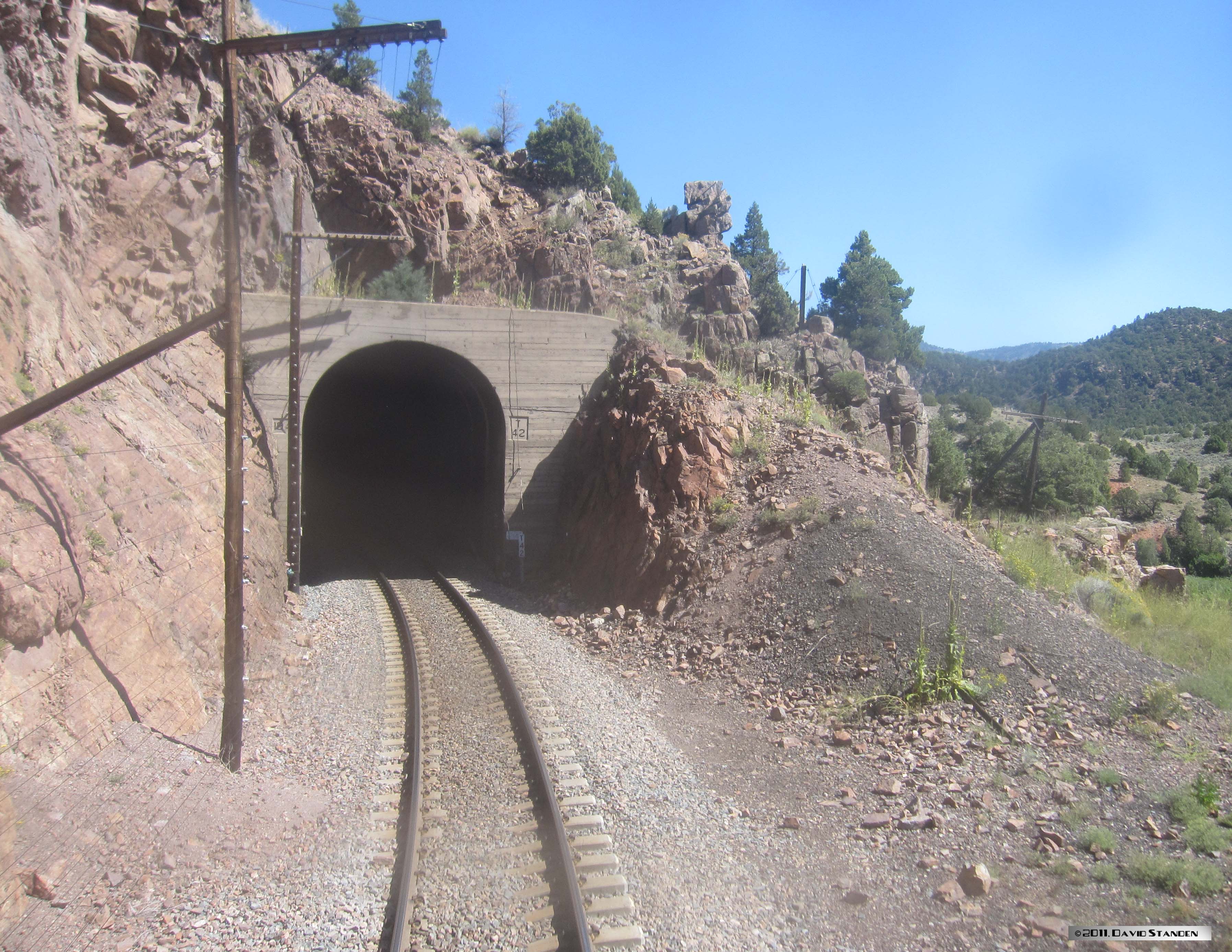 Tunnel 40.Top: Not the greatest scan, but off in the distance you can see the west portal. This is located a few miles east of Radium, and is the centermost of three tunnels between Radium and Azure. The tunnel is only 63 feet in length. The canyon of the Colorado here is confined but not precipitous, and very popular with river-rafters (and therefore, Zephyr Salutes are common!).Bottom: A closer view, taken out the back door of Amtrak in 2011 by David Standen. Notice you can see through the tunnel even on this curve; it’s very short.NEW IMAGE | ||