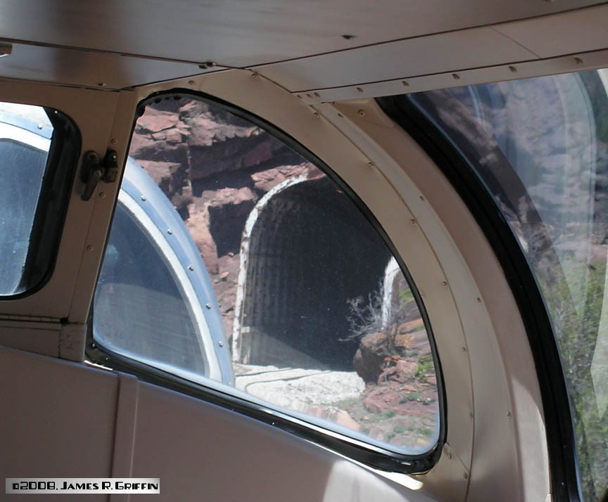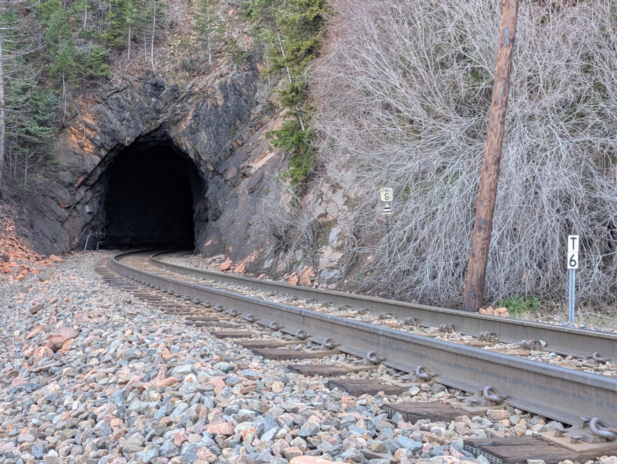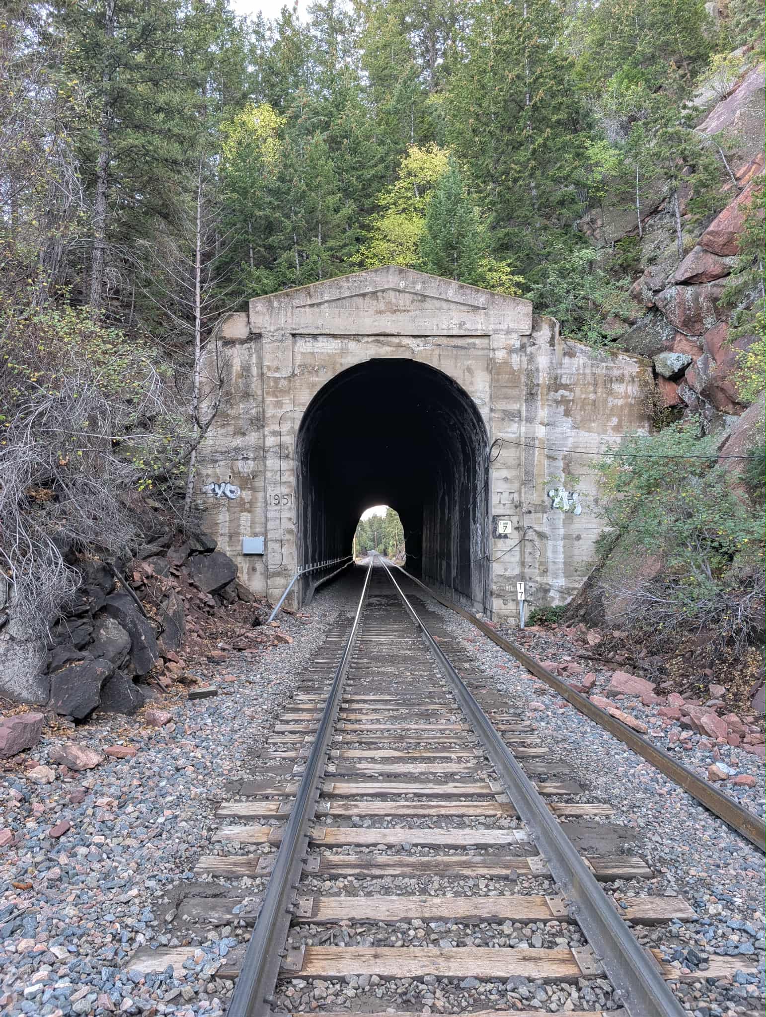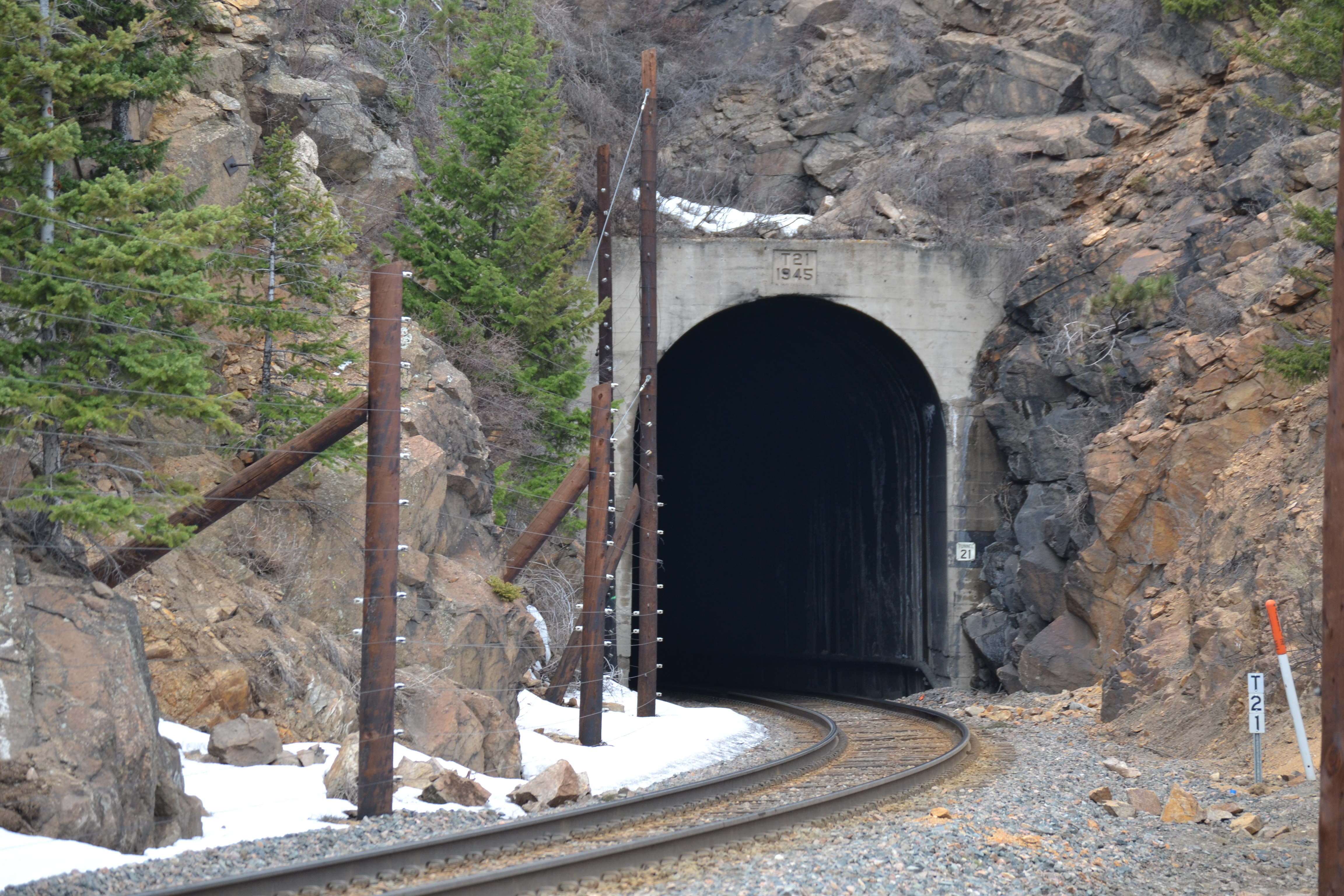 Tunnel 40.Top: Not the greatest scan, but off in the distance you can see the west portal. This is located a few miles east of Radium, and is the centermost of three tunnels between Radium and Azure. The tunnel is only 63 feet in length. The canyon of the Colorado here is confined but not precipitous, and very popular with river-rafters (and therefore, Zephyr Salutes are common!).Bottom: A closer view, taken out the back door of Amtrak in 2011 by David Standen. Notice you can see through the tunnel even on this curve; it’s very short.NEW IMAGE | ||