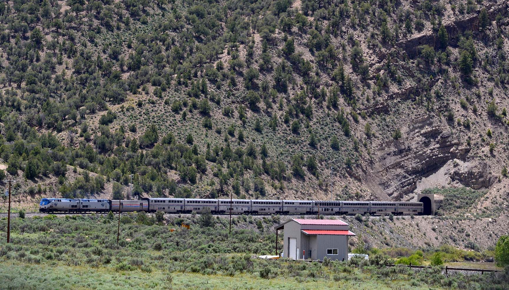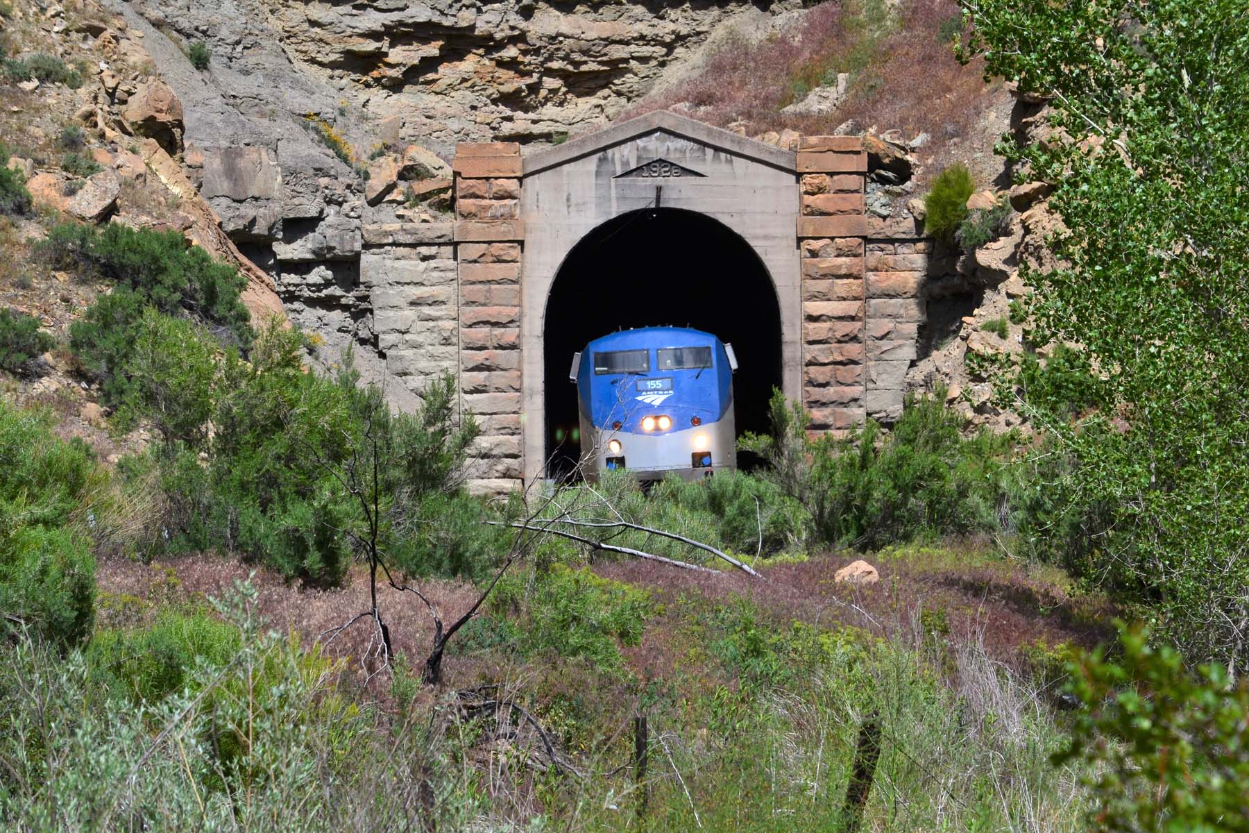 Beaver Tail Tunnel (763′), east of Cameo in Debeque Canyon, was bored around 1890 and the tunnel facings improved in 1928.Top: The east portal; Amtrak No. 6 exiting. (9/03/2018)Bottom: The west portal, Amtrak No. 5 exiting. Note the use of local stone for the pilasters. (5/31/2019) | ||