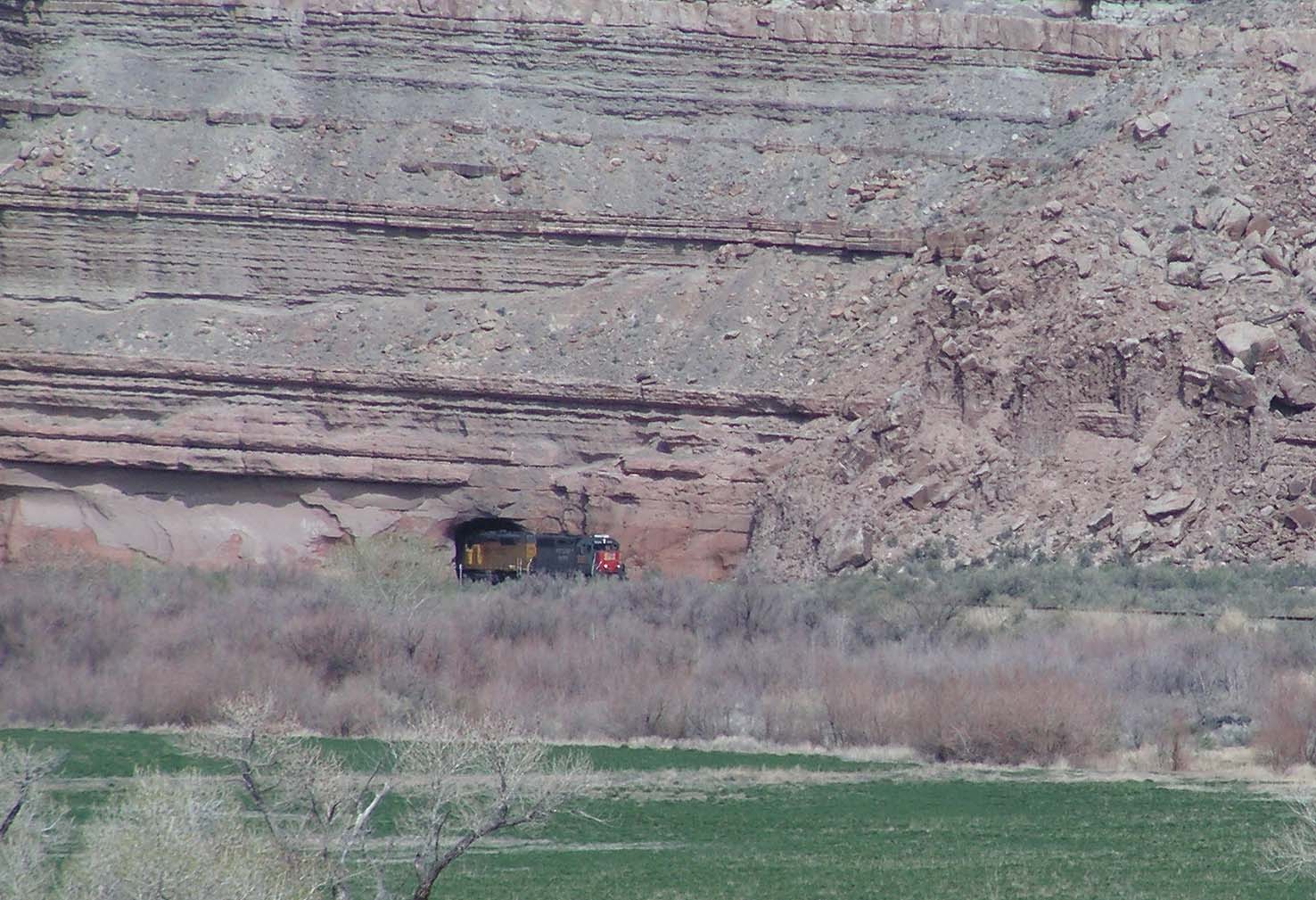 The twin Nolan tunnels are located not far above Helper, Utah on the climb to Soldier Summit. Top: a set of Utah Railway helpers are approaching the tunnels on the eastern track. Bottom: Exiting the tunnel going uphill (to the left).(11/10/2001) |