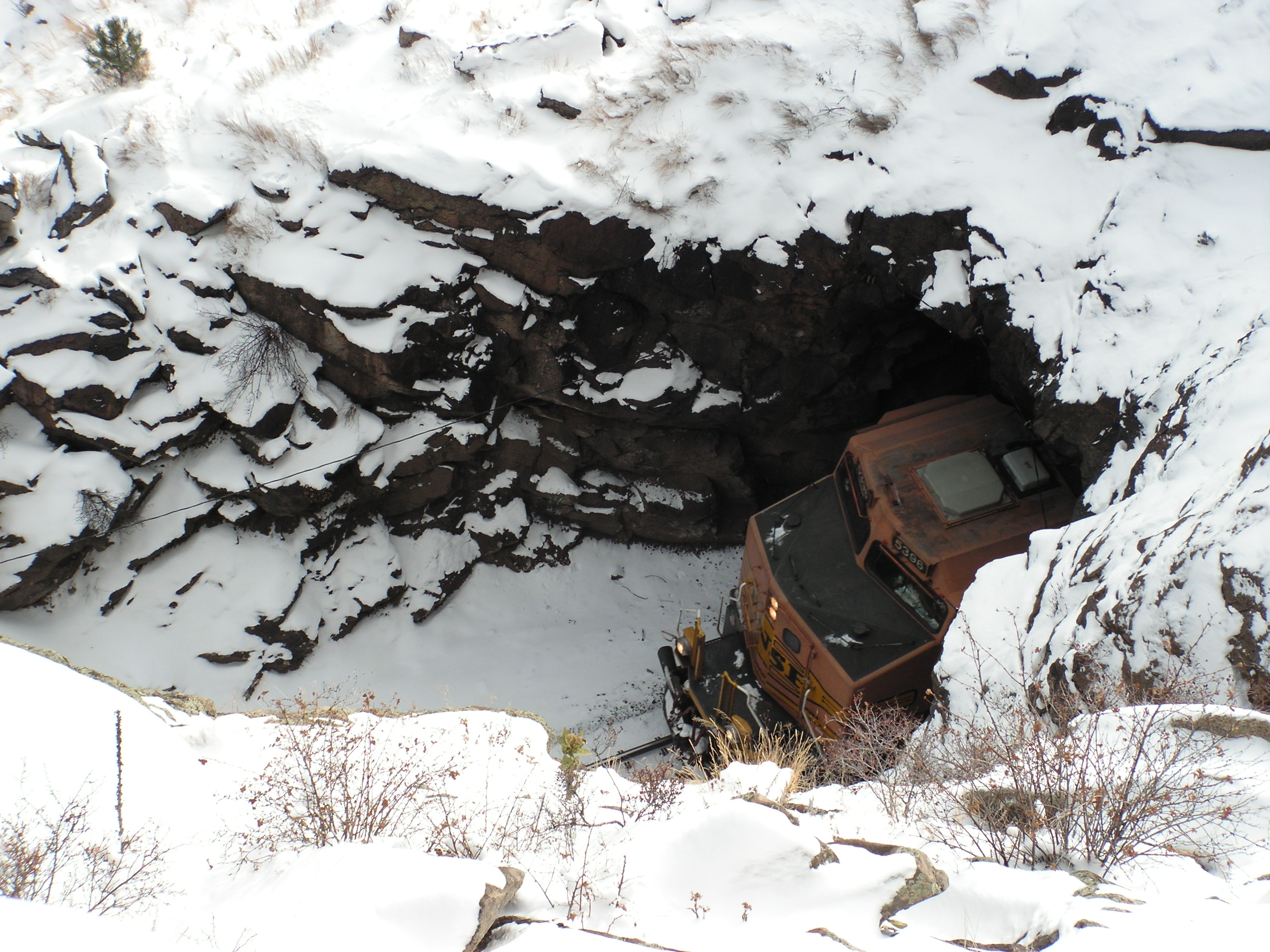 Ultra-short Tunnel 29 (78 feet). It doesn’t even get dark inside when you pass through. Top: This is the east portal, from November 1994 as the swing helpers on a loaded PSCX coal train pass through. UPDATED IMAGEBottom: West end. This is a fun perspective, looking down at the track as a westbound BNSF train emerges. Scrambling around on a snowy cliffside 75 feet above the track is, shall we say, exhilarating. (December 2008) |