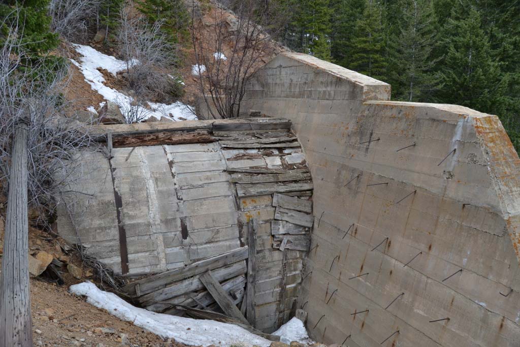 Tunnel 20. (460′)Top: east portal. As one of the few tunnels you can see through, it’s popular with railfanographers. The portal work was performed in 1947 on the east portal.Tunnel 20, west portal. Middle: the back side of the west portal. You can see how the railroad never even removed the forms built to pour the concrete.Bottom: the west portal. The portal work was performed in 1948 here on the west end.(April 12, 2014) |