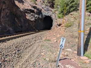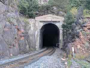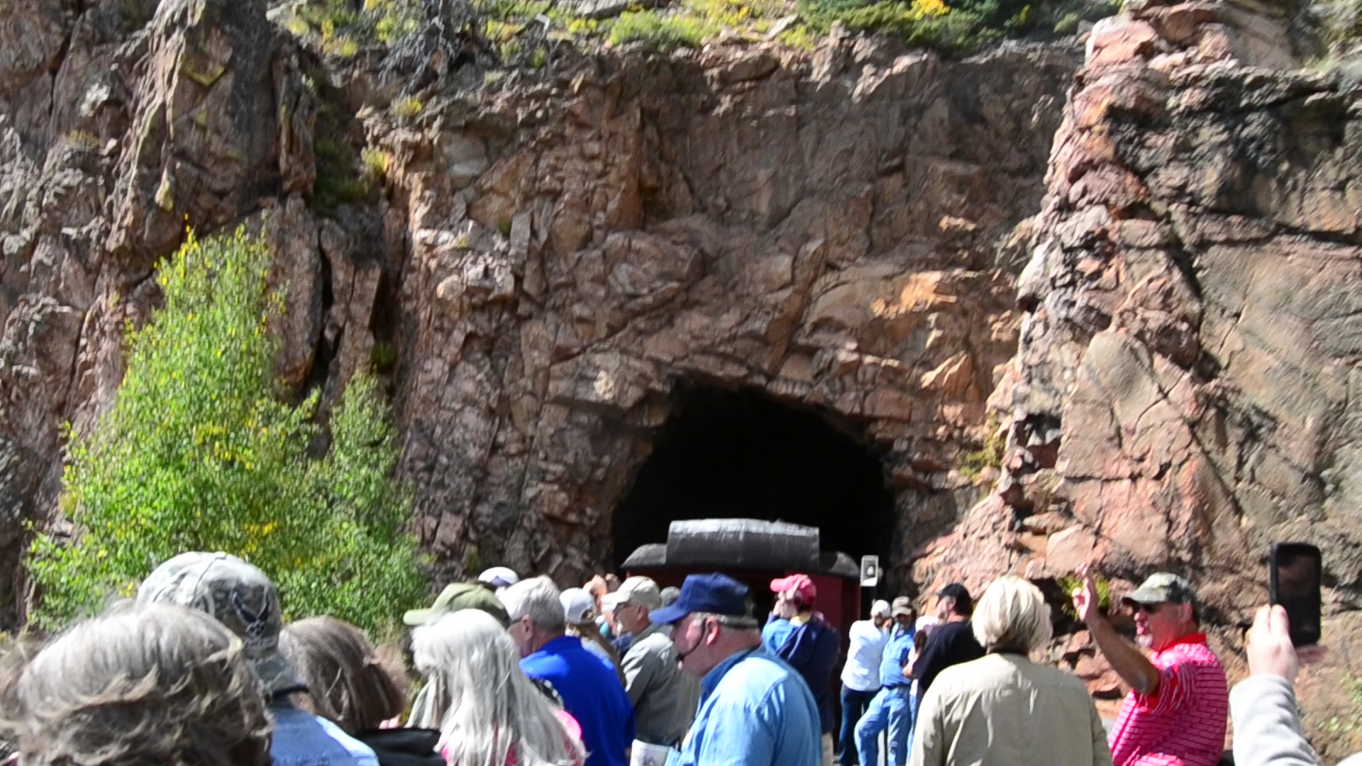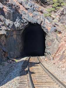 Yes, the narrow gauge lines had a couple of tunnels too! This is Rock Tunnel (366′), the eastern portal, seen from the open gondola on a C&TS ride on September 22, 2018. | ||