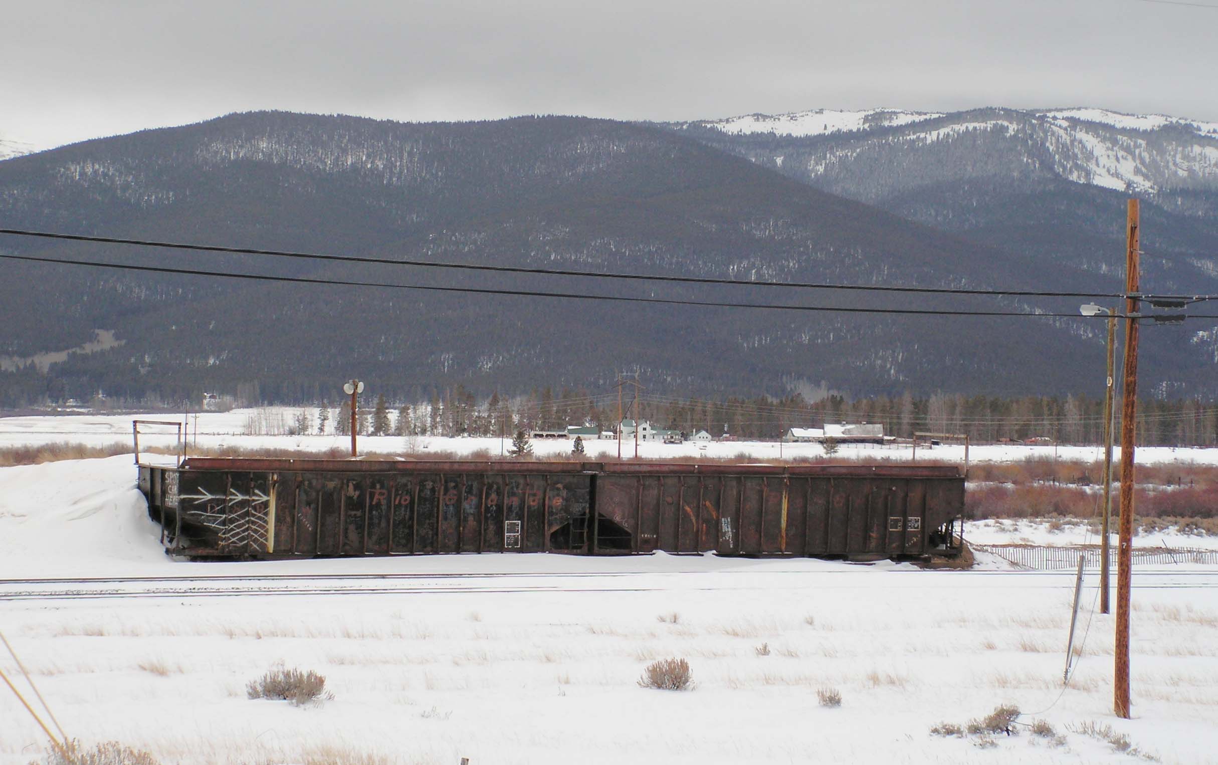 Something completely different: a wreck cleanup. On August 7, 1982 (the day we got married, as it happens), an eastbound Rio Grande freight entered the west end of Byers Canyon at an excessive speed. There’s an extremely sharp curve here (20 degrees). The lead locomotive made it around the 20-MPH curve going 57 MPH, but all the trailing units left the rails, as well as a substantial portion of the train. One week later, I took this photo from onboard the Rio Grande Zephyr. A number of gondola cars were parked on the house track at Flat (just west of Parshall), loaded with pieces of the wreckage from the cleanup. | ||