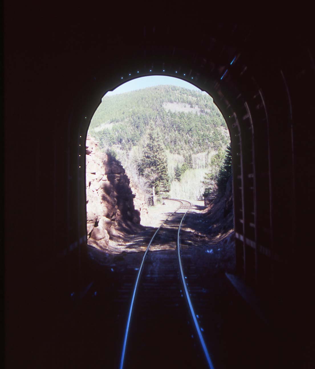From aboard the Rio Grande Zephyr– the east portal of tunnel 36. Tunnel 37 is visible ahead of the power. (11/07/1981) | ||