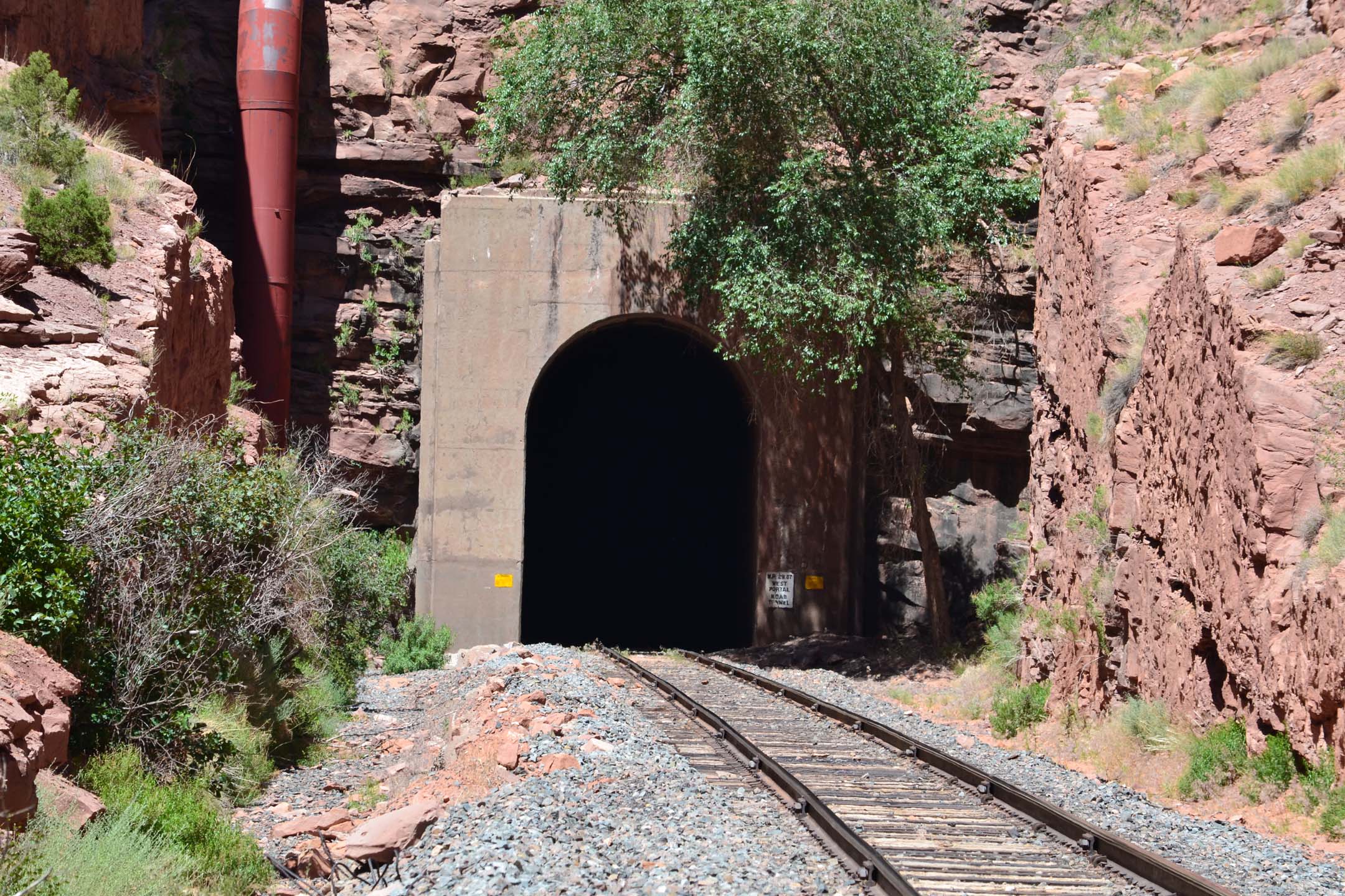 Cane Creek branch (Moab) tunnel (7,075′). Constructed 1962. Top: the tunnel in context. The south portal is located in a notch in Poison Spider Mesa, within a runoff channel. On the occasion of a rainstorm a lot of water flows through here. So Morrison-Knudson, the contractor for the construction, built a catch basin above the portal with a large runoff pipe to redirect water around the portal and into the natural channel along the west side of the right-of-way.Center: closer look at the structure. There is just enough moisture to support some foliage– barely.Bottom: Me, showing you what 108 degrees feels like. Behind me are the no-trespassing signs warning you of dire federal consequences if you go into the tunnel (and you’re not a train, I guess?). The other sign which says “Moab Tunnel” seems to be of Union Pacific origin; prior to that the tunnel had other, informal names but nothing official.NEW IMAGES |