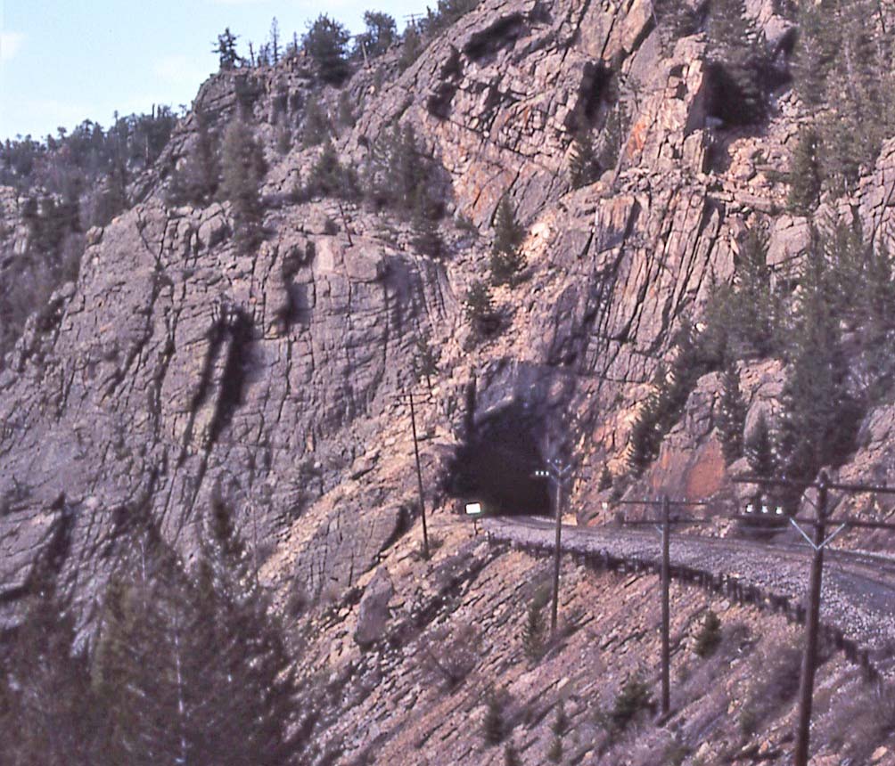 Bridgeport Tunnel (2,252′), the east portal. This tunnel is located south of Grand Junction, partway down the North Fork branch along the Gunnison River. When originally built in late 1883 this was on the narrow gauge mainline, and later (1906) it was enlarged for standard-gauge clearances. However, you can see that the headroom was not improved by much. | ||