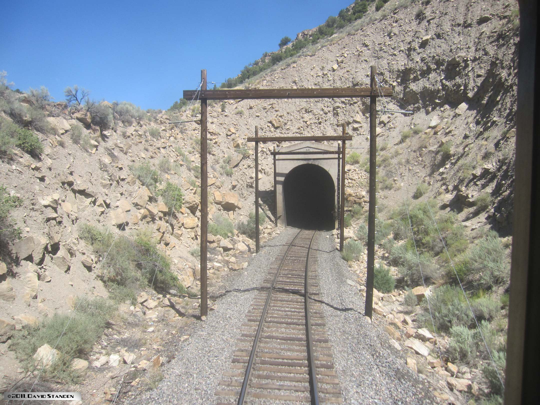 Sweetwater TunnelTop: This is the east end of (1,115′), midway along the Dotsero Cutoff, just west of Range. Amtrak train No. 6 is just exiting the bore. This tunnel was dug as part of the cutoff’s construction and opened for service in 1934. (5/31/2019)Bottom: The west portal, taken by David Standen from Amtrak’s rear window in August 2011. NEW IMAGE | ||