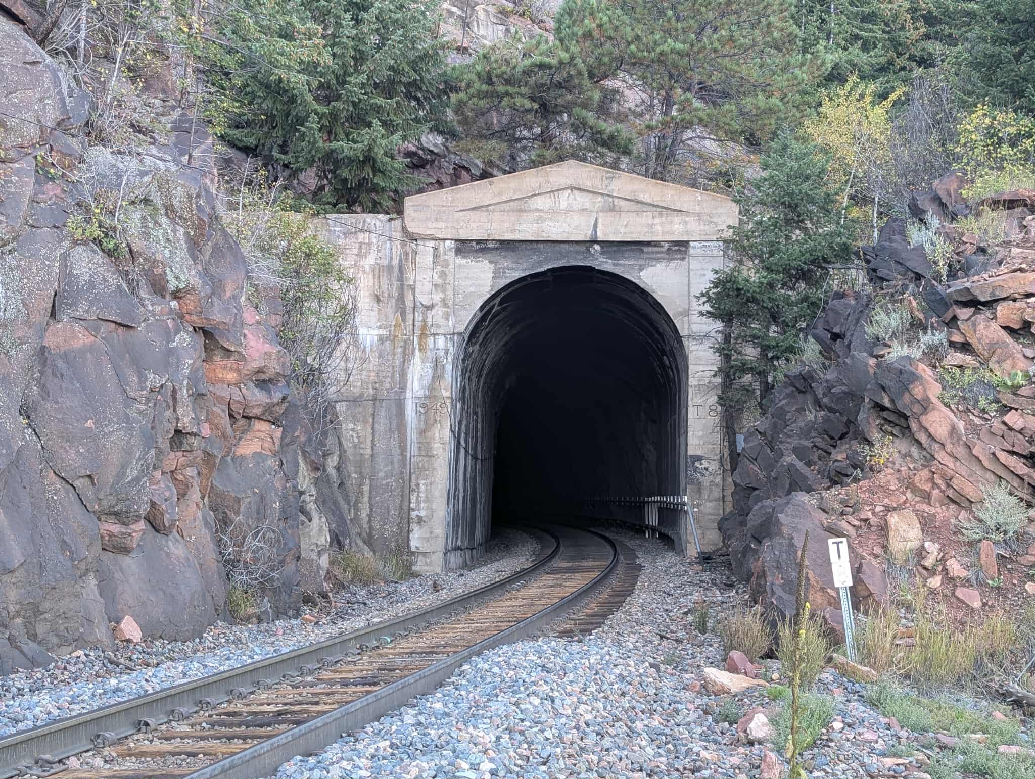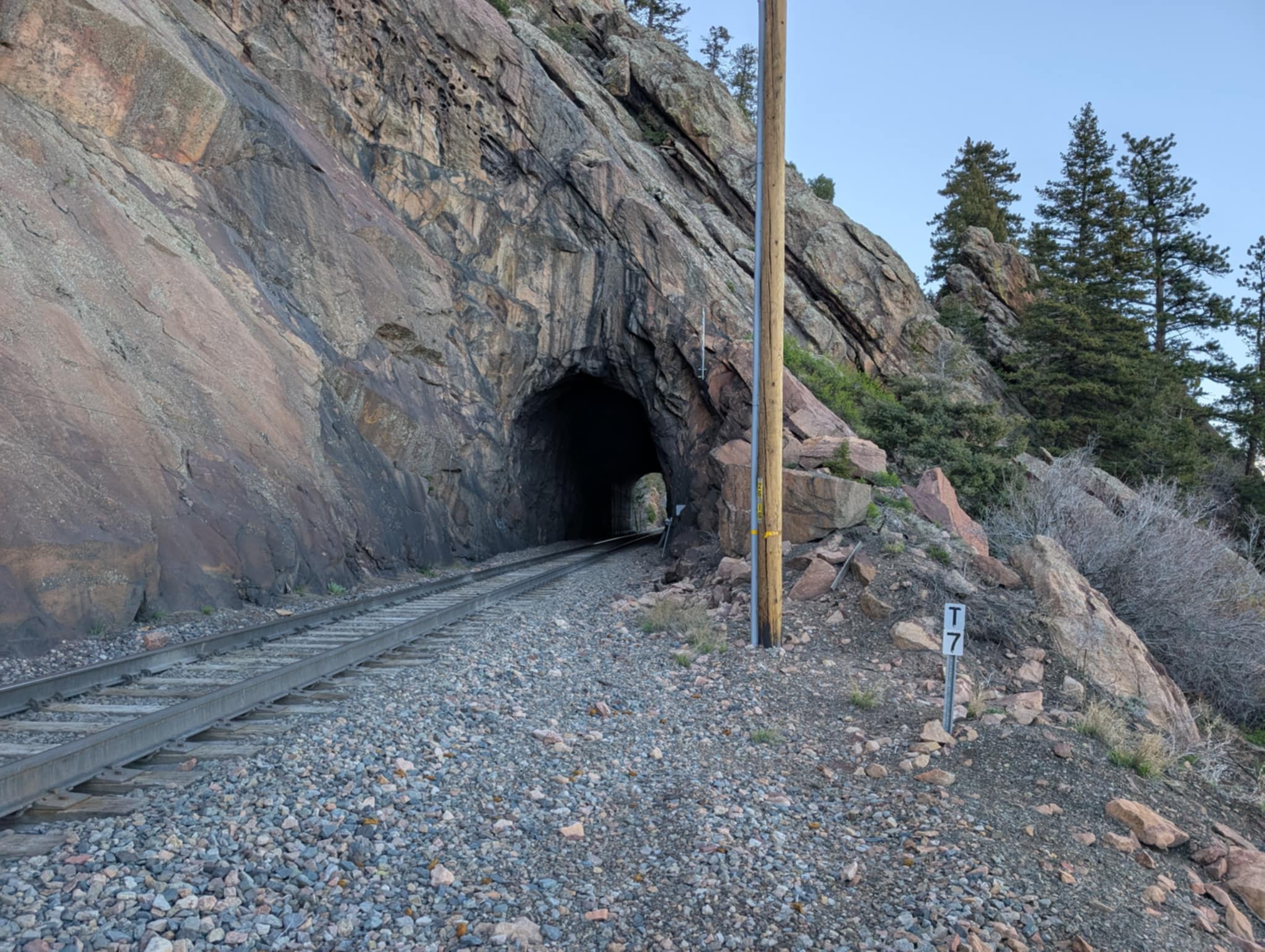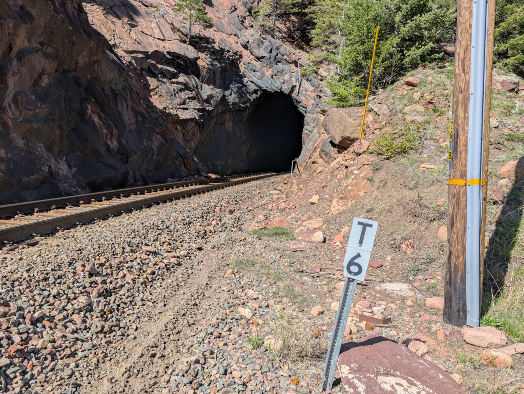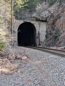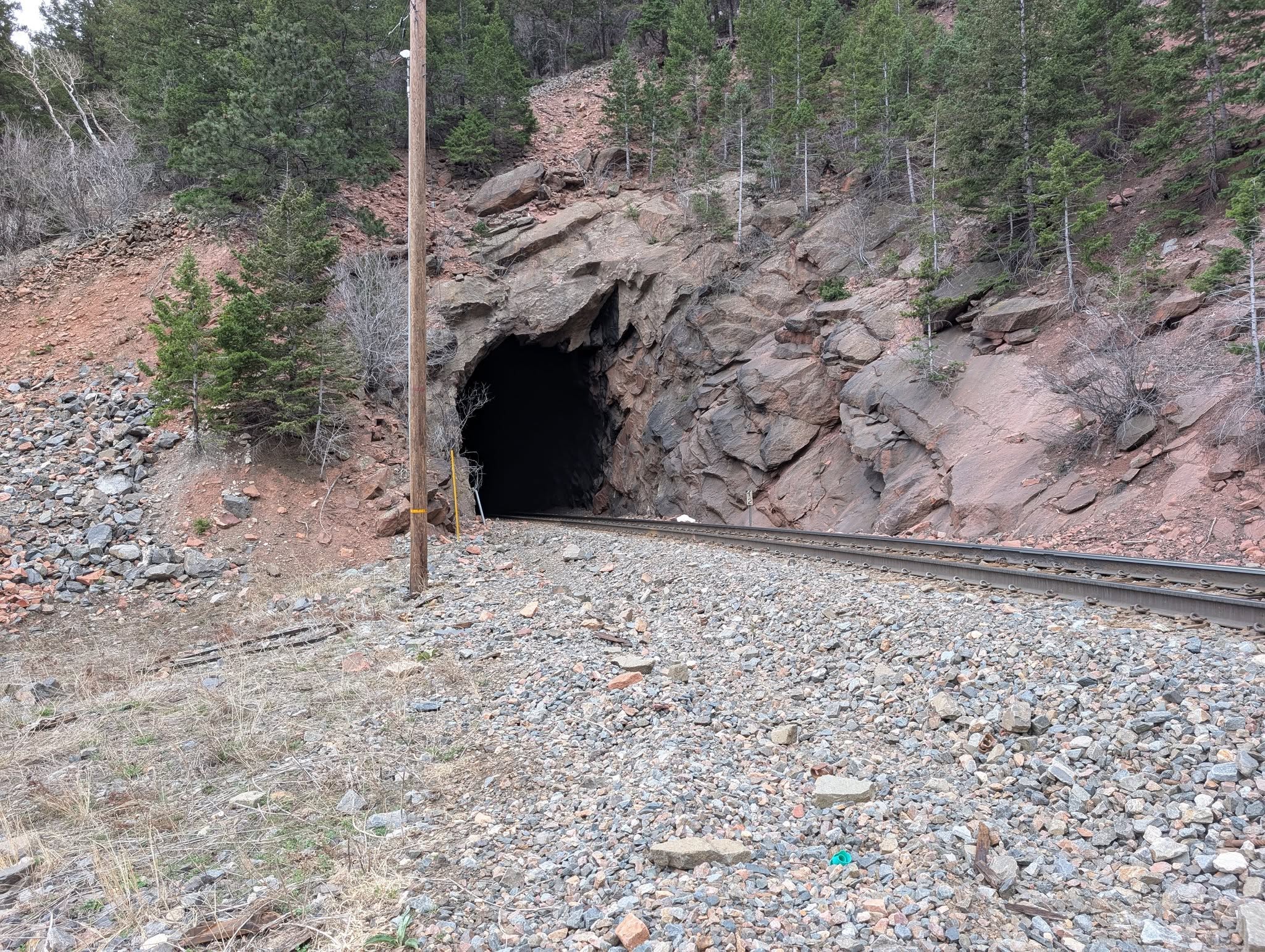 Tunnel 2 (516′) Top: East portal. The track approaches along the shelf at left, then makes a hard left turn to dive through the hogback. This portal is stable and is just bare rock. From aboard the Winter Park Express, Feb. 2018 Bottom : the west (north) portal. Photo courtesy of Robert William Romaine. NEW IMAGE |