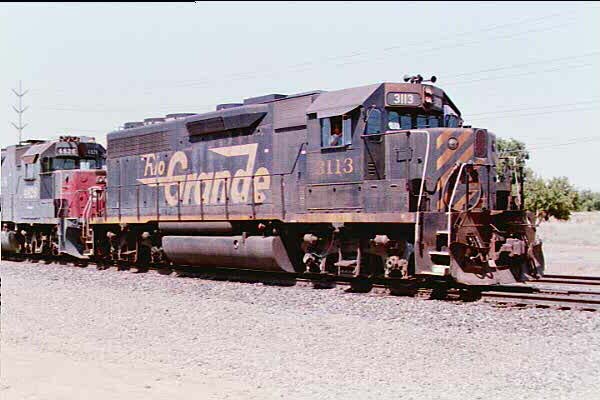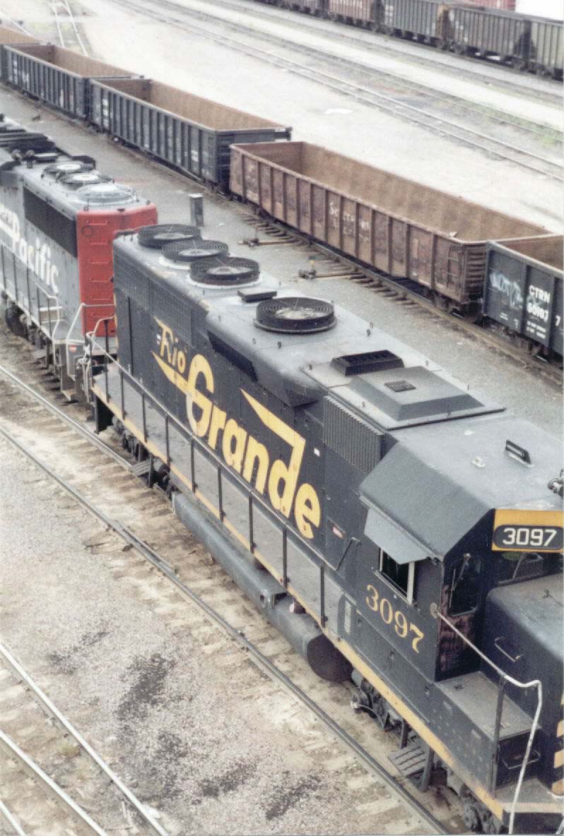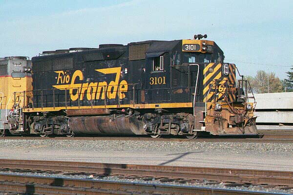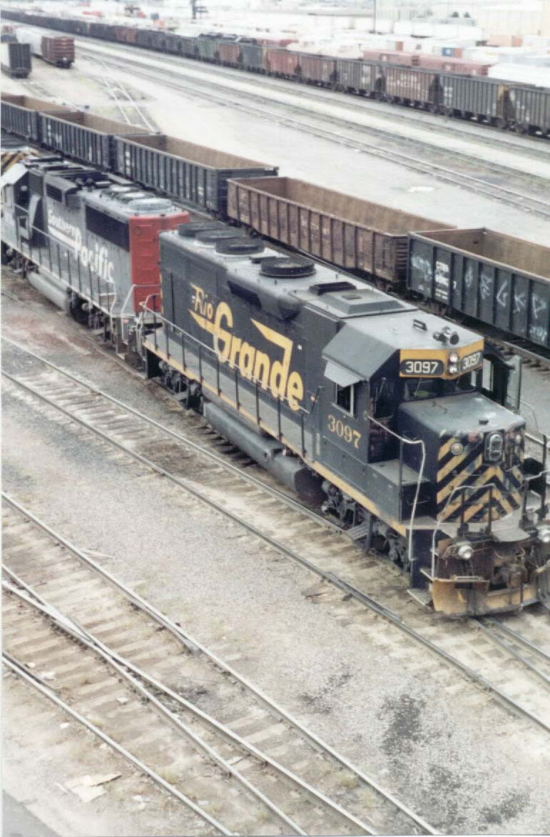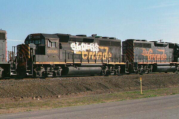 No. 3096, along with GP40 No. 3135, working a local in central California, circa 2000.It kept this paint and number until 2005, when most of the remaining D&RGW units were scooped up in the UP renumbering process.