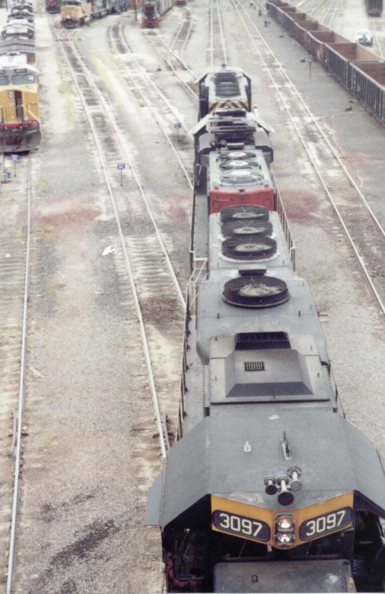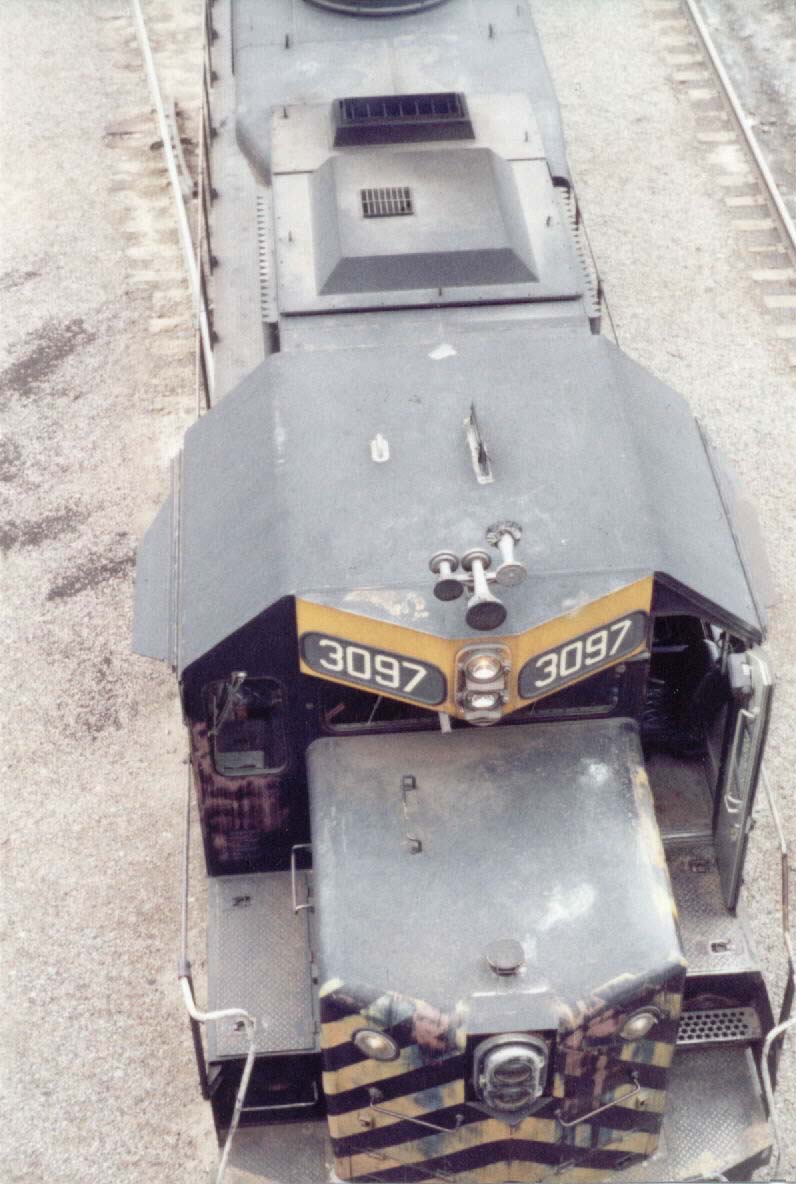 Four top views of GP40-2 No. 3097. These were sent to me by Dave Crinklaw back in December 2000, and somehow I never dealt with them. After 16 years I rediscovered them in my inbox, so here they are! All I know about them is that: (1) they were taken in North Yard off the 48th street viaduct, and (2) they were taken sometime prior to December 5, 2000.These are nice sharp images and provide good looks at the top details of this early-version GP40-2. Too bad we can’t make out the numbers of the other two locomotives in the shots. | ||