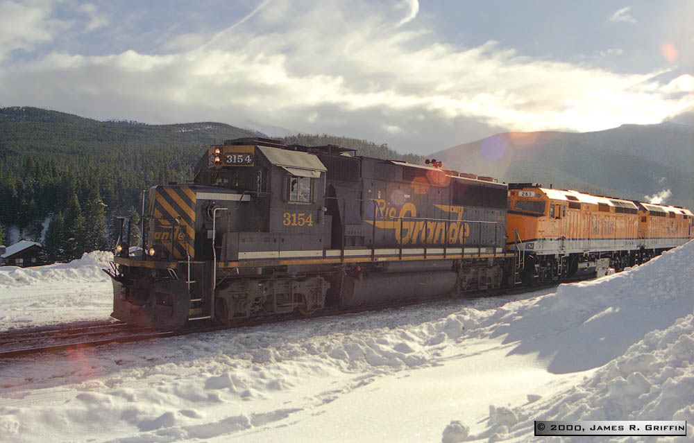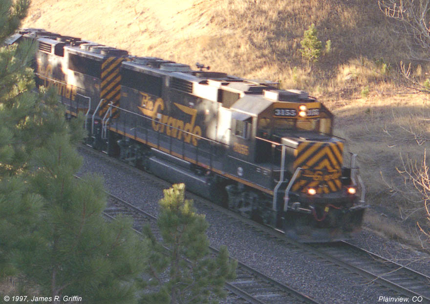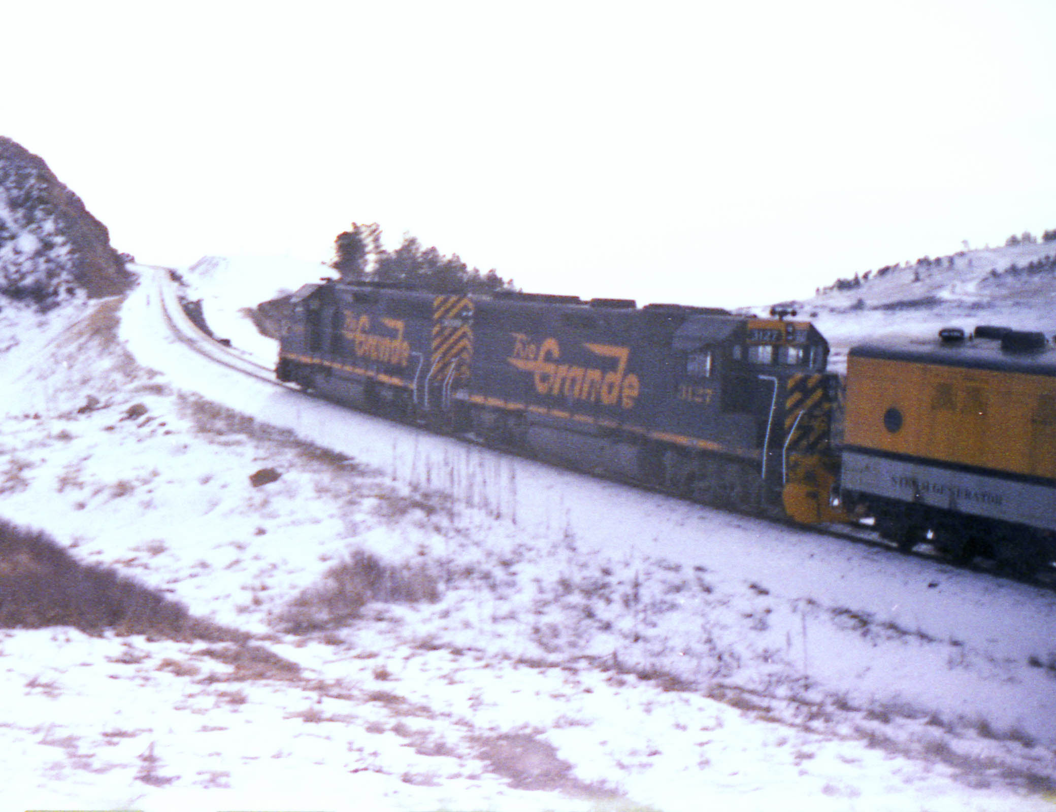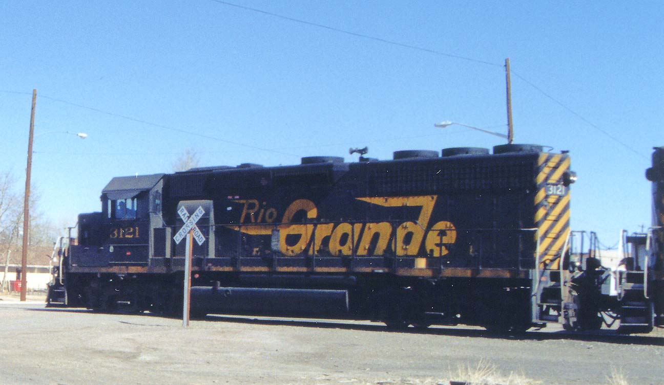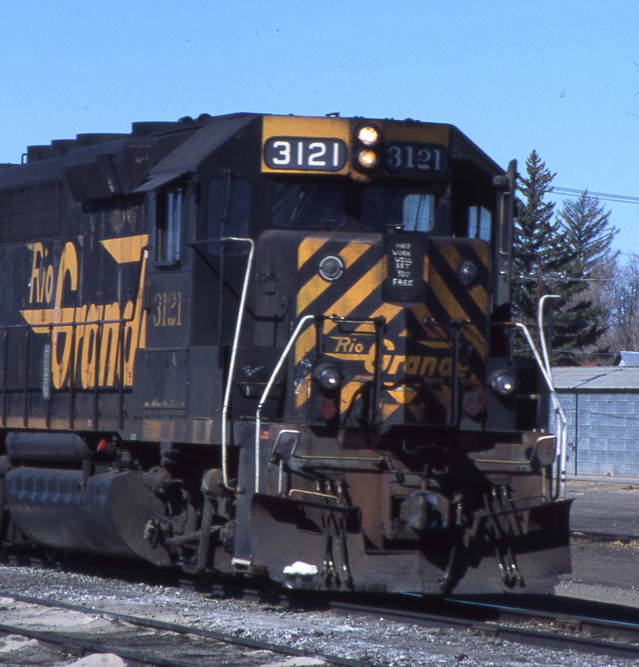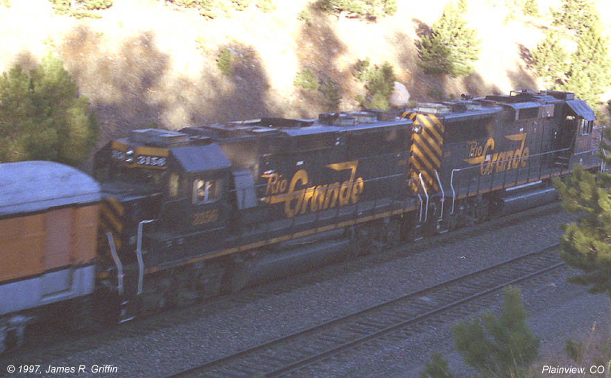No. 3156 — the trailing unit of a pair of GP60’s, with the Ski Train at Plainview (1/04/1997). The DRGW GP60s were used commonly on the Ski Train during the 96-97 season, making for an all- Rio Grande passenger train (in the era of UP ownership, more’s the irony).
