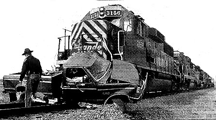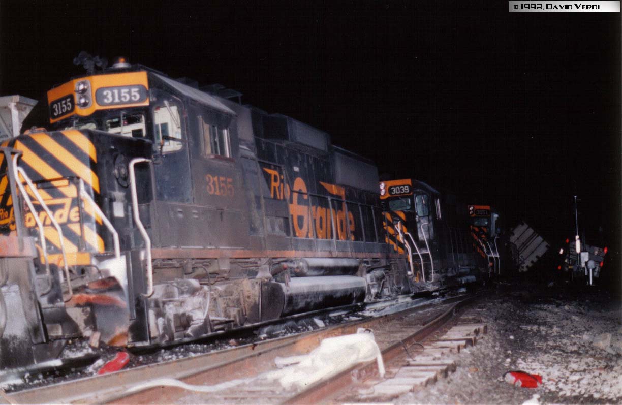 Beat the Train? Nope. “(AP) Colorado State Trooper Bill Judy investigates the scene of a fatal train-truck crash about 10 miles south of Fountain, Colo., Monday. A man from Pueblo, Colo., was killed when his truck collided with the Rio Grande train.” – Article from December 1996, where the MDVPU (Denver-Pueblo) daily freight powered by all three Rio Grande GP60’s was involved in this unfortunate incident. | ||