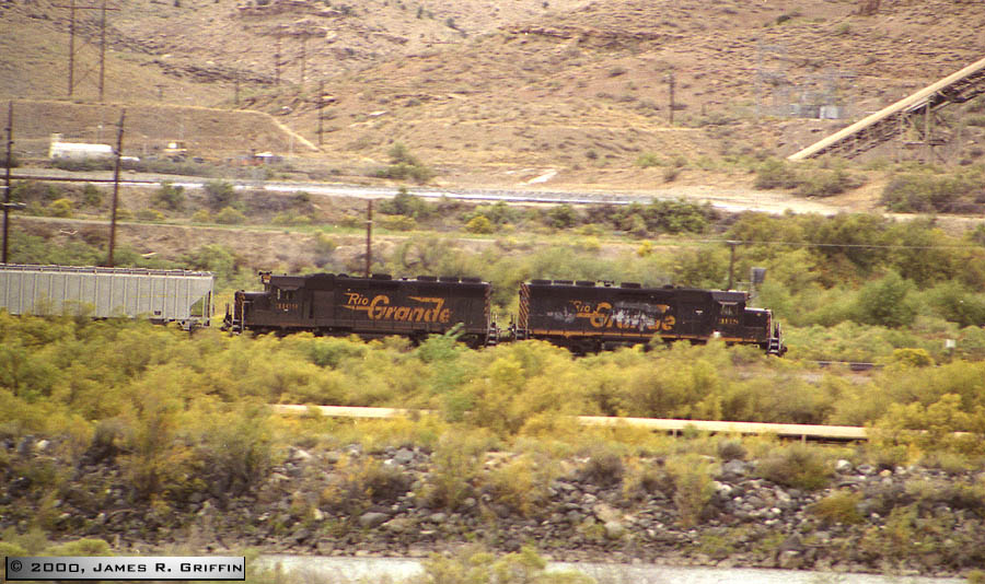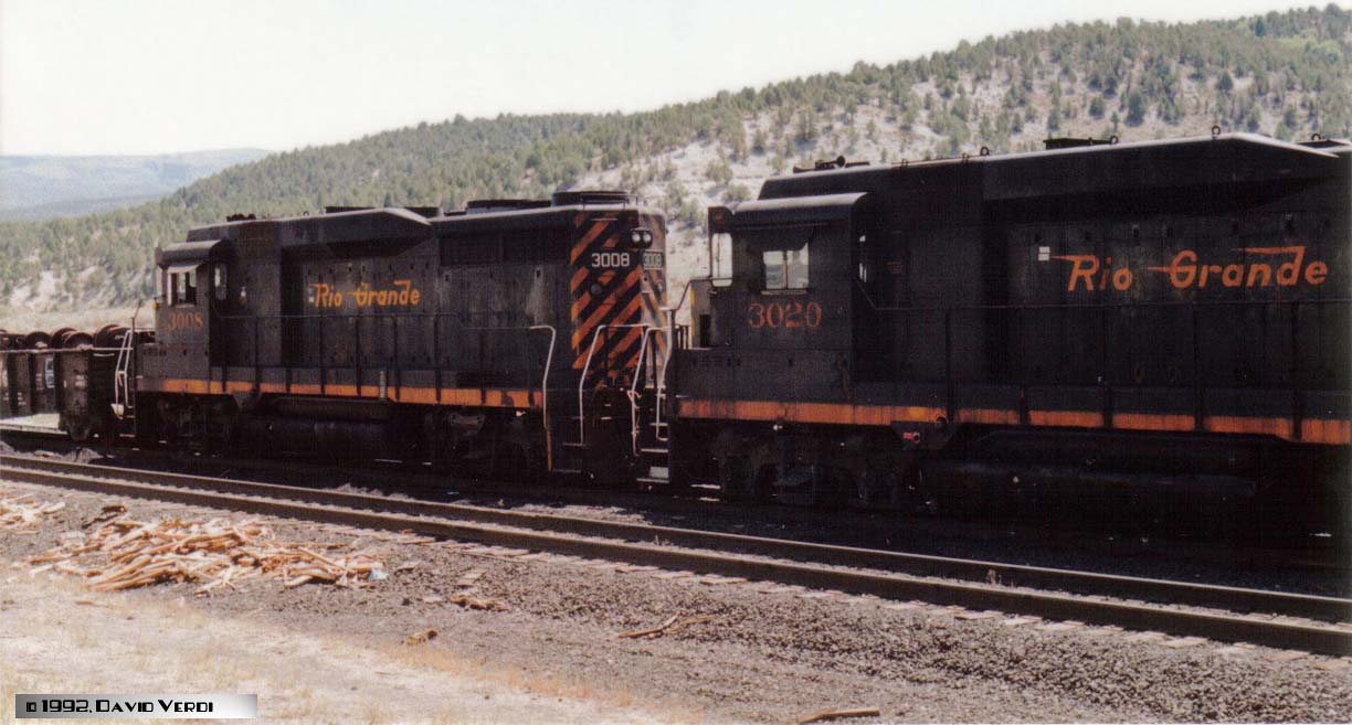 Two GP30’s, Nos. 3008 and 3020, seen on a work train near Mill Fork, UT on 8/28/1992.These units represent both orders of Rio Grande’s GP30’s. Note the difference in cab length. The 3008’s cab is shorter, so there is an extra handrail stanchion just behind the cab. Photo courtesy of David Verdi.