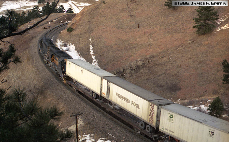 No. 3116 (along with GP40 No. 3077) leads the eastbound Railblazer overnight piggyback train on the last leg of its trip from Salt Lake to Denver, on Christmas Eve morning, 1988. This hot overnight TOFC train kept the rails warm between Denver and Salt Lake for the latter half of the 1980’s. It was the ultimate short fast piggyback train… | ||