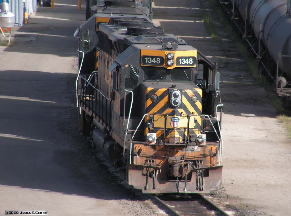 Top Photo: No. 3126 at Grand Junction on 8/03/98. Notice an unusual feature: ditch lights on the rear as well as the front. These are installed on locomotives that are used predominately in local service, where running long-hood-forward frequently can be expected. Their location above the deckline indicates an SP-era modification. Bottom Photo: The 3126 was renumbered (patched) as UP 1348 on April 27th, 2005. Here she is seen parked next to the North Yard tower on 9/01/2008. All lights are still in place, and she looks pretty good for a 34-year-old lady. |