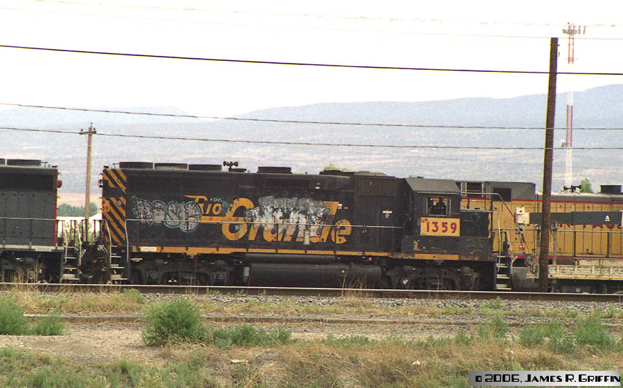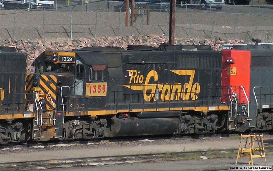 I have a LOT of photos of No. 3118. Here’s a representative selection. Top photo: It sits on the readyline with the rest of the power for the Alamosa local, in the yard at Pueblo (9/19/1999). It’s been modified with a beacon (courtesy of the SPL era), the horns have been moved to the long hood (judging by the color, they were later replaced by UP), and ditch lights have been added. But, the low nose lights are still there. The opposite side of the unit has been heavily vandalized by taggers. Middle photo: The 3118 was patched to UP 1359 on 9/15/2005. Here it is in Grand Junction on July 1st, 2006. Bottom Photo: The now- UP 1359 is parked at North Yard on 9/01/2008, coupled with DRGW alumnus UP 1348 (ex-DRGW 3126) and UP 1534, ex- SP 7299. Note 1359 still has the complete light package in place, though no word on whether they all work. |