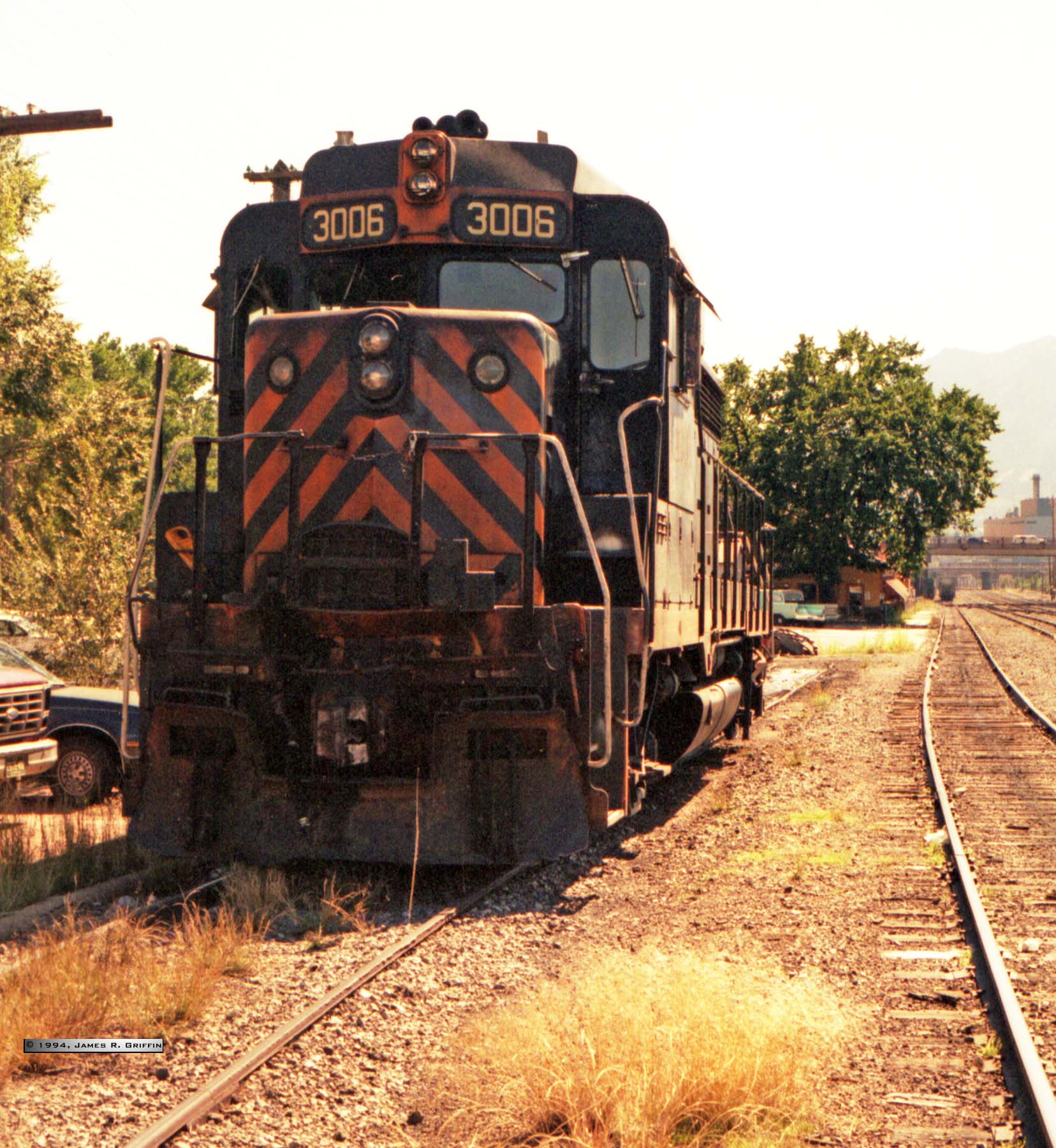GP30 No. 3006, two views, at Colorado Springs in September 1994. The Rio Grande and its two successor roads typically kept a four-axle unit in the Springs to handle the local chores. There are a number of industries around the city that are served by the railroad. As of 2024 there is still a Rio Grande caboose that is used for the local jobs.