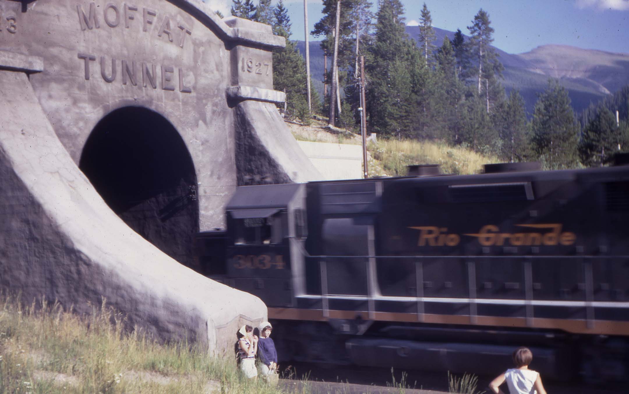 GP35 No. 3034 entering the Moffat Tunnel on Labor Day weekend 1966. Though the framing of the photo is unfortunate, we can see that the unit is leading a train (not possible after 1972). Also note the tall exhaust stack. I enjoy seeing the 1960’s fashions; the tunnel was a popular place for travelers to stop and watch trains. Photo by my dad (I was only 6 then!) The 3034 was retired October 1991. Later rebuilt by Omnitrax as a GP38-3, and as of 2022 is CEFX 3034. |