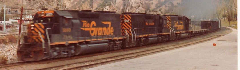 GP40B No. 3052 is in the middle of a consist rolling through Glenwood Springs on 11/08/1981. This photo by my sainted mother. Another simultaneous view here.