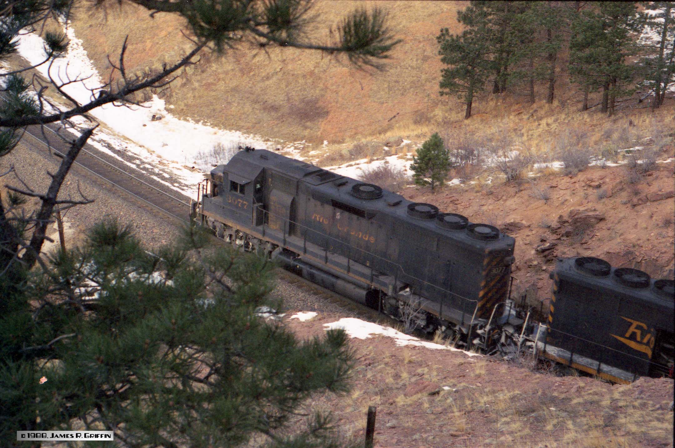 Nos. 3111 and 3117: the West Helper on a CSDPU train. The two GP40-2s apply dynamic braking on the rear of the train as it crosses Coal Creek canyon on April 8th 1984. The West Helper (set) would often ride a heavy eastbound train down the mountain for braking, then return light or with another train to Tabernash. Note the red class light on 3111.