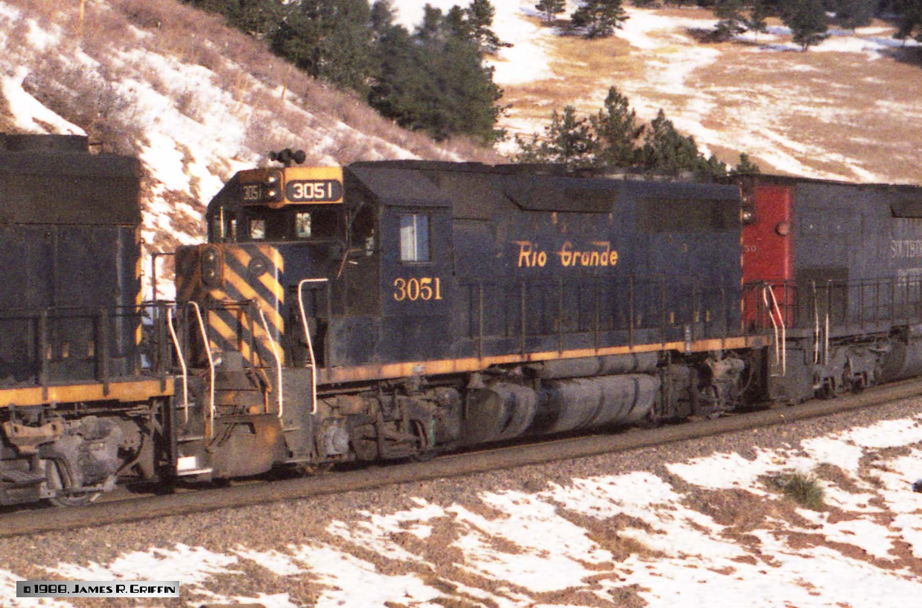 GP40B No. 3051 — Dec. 24, 1988, on a westbound manifest at Tunnel 1 above Denver (shortly after the SP merger).