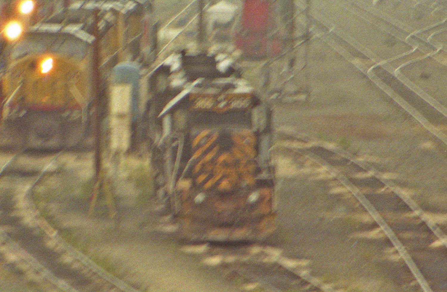 No. 3105, near the sand dump track in Denver North Yard. That’s 3100 coupled on behind (trust me). It has post-merger mods, particularly the Mars light removal and the addition of ditch lights. So many things I would do differently if I could go back to that drizzly afternoon… (9/19/1999) NEW IMAGE |