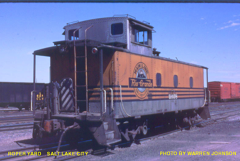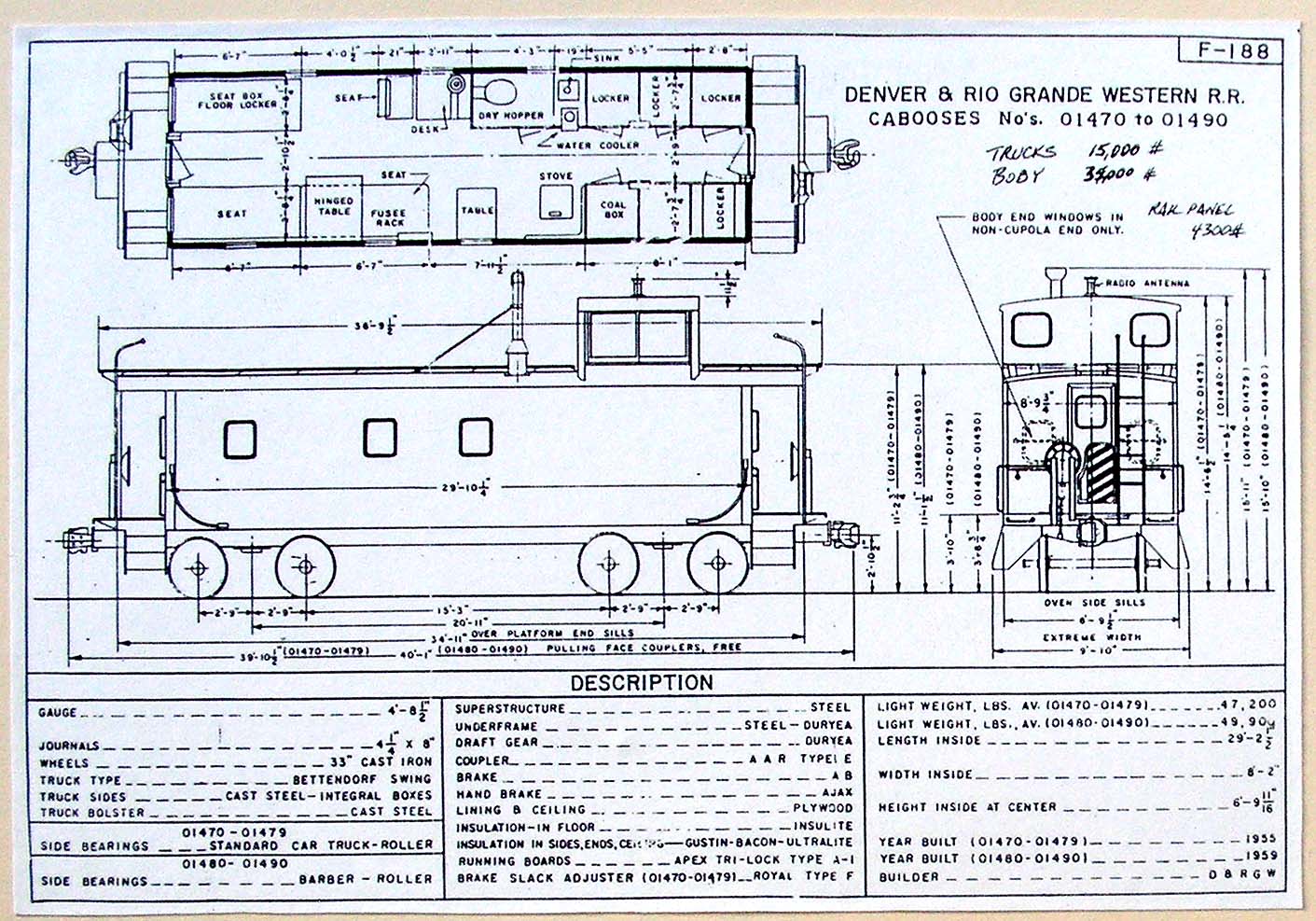 | Below are photos of a few later Rio Grande cabooses (i.e. WW2 to present). Good data on these hacks is available at Don Strack’s Utah Rails D&RGW Caboose page .Here is the Folio Sheet of the series 01470 to 01490. (It’s a photo of a reproduction mounted in the “Ski Train” museum caboose in Hot Sulphur Springs). A point to note is that, unlike all the earlier cars, 01470 through 01490 were built of welded design and thus lacked riveted seams. (I found it ironic that this particular folio was hanging in a riveted car, but whatever…!)The Rio Grande 01400 series cabooses were unique. They were built in the railroad’s own shops and to its own design. Distinctive Rio Grande features include: the posts at the corners; the ladder tops which end pointing up at an angle, rather than curving down to the rooftop (unlike many model cabooses); the extra-height cupola; the cupola side window style. Also note the two marker lights, added late in their careers. The one on the right corner was red and was used as the usual EOT marker. The one over the door was white and was used primarily to give the crew illumination out the back. This would be handy for night backup moves, for instance. It was seldom illuminated during daylight.Modeler’s notes: the only semi-accurate models of these cabooses in HO are in brass (OMI) or in resin (ProtoWest). The Athearn caboose is a Santa Fe prototype and is the correct length, though the windows are completely different from the D&RGW cabooses, the roof has far too much arch, the roofwalks curve with the roof instead of being flat, the trucks are too close together, and the cupola is too short. In other words, it’s a stand-in only. Your other option is to scratch-build, which I have done. | |||