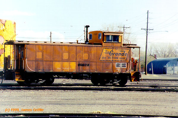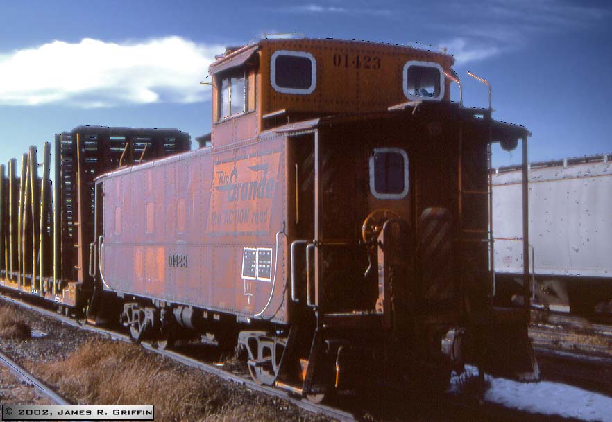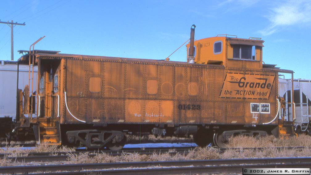 Caboose #01423 TOP: Here it sits by itself in Alamosa (downtown) on 5/16/1999. This cabin was used on the local to Antonito, and was one of the last Rio Grande cabooses in active service. As with most cabooses active on the Rio Grande in the early 1980s, the body side windows were plated over with steel (only the end door windows were left).NEXT: Several other looks at 01423, taken in March 2002 at Alamosa’s east yard.UP kept the caboose in Alamosa for the local service right up until the sale of the branch to San Luis Rio Grande in June 2003. The caboose was sold along with the rest of the branch, and was used by the SLRG until the sale to Permian. Sometime after these photos, the car was tagged by local nocturnal street “artists”. Ownership was transferred circa 2004 to the “Wagon Wheel Gap” tourist line between South Fork and Creede. However, the line never used most of their rolling stock for anything, and so the caboose was stored on a spur in Monte Vista just north of the highways 160 – 285 intersection until being sold to a private owner circa 2015. It now resides in Albuquerque.The 01423 was built in 1942. Here is a page of walk-around photos of 01423, many of which are close-up detail views. These photos were taken in Monte Vista on 12/27/2009. |