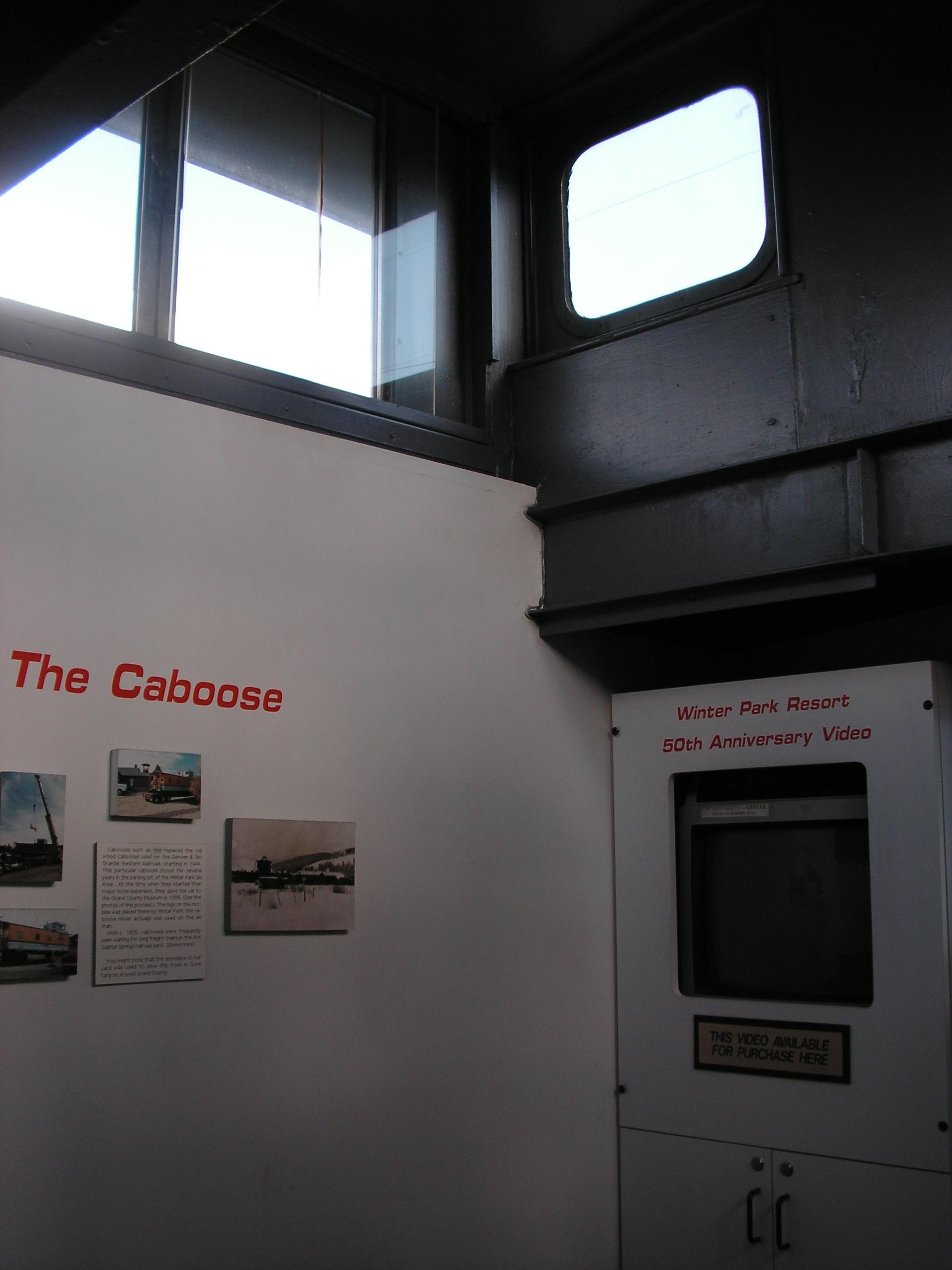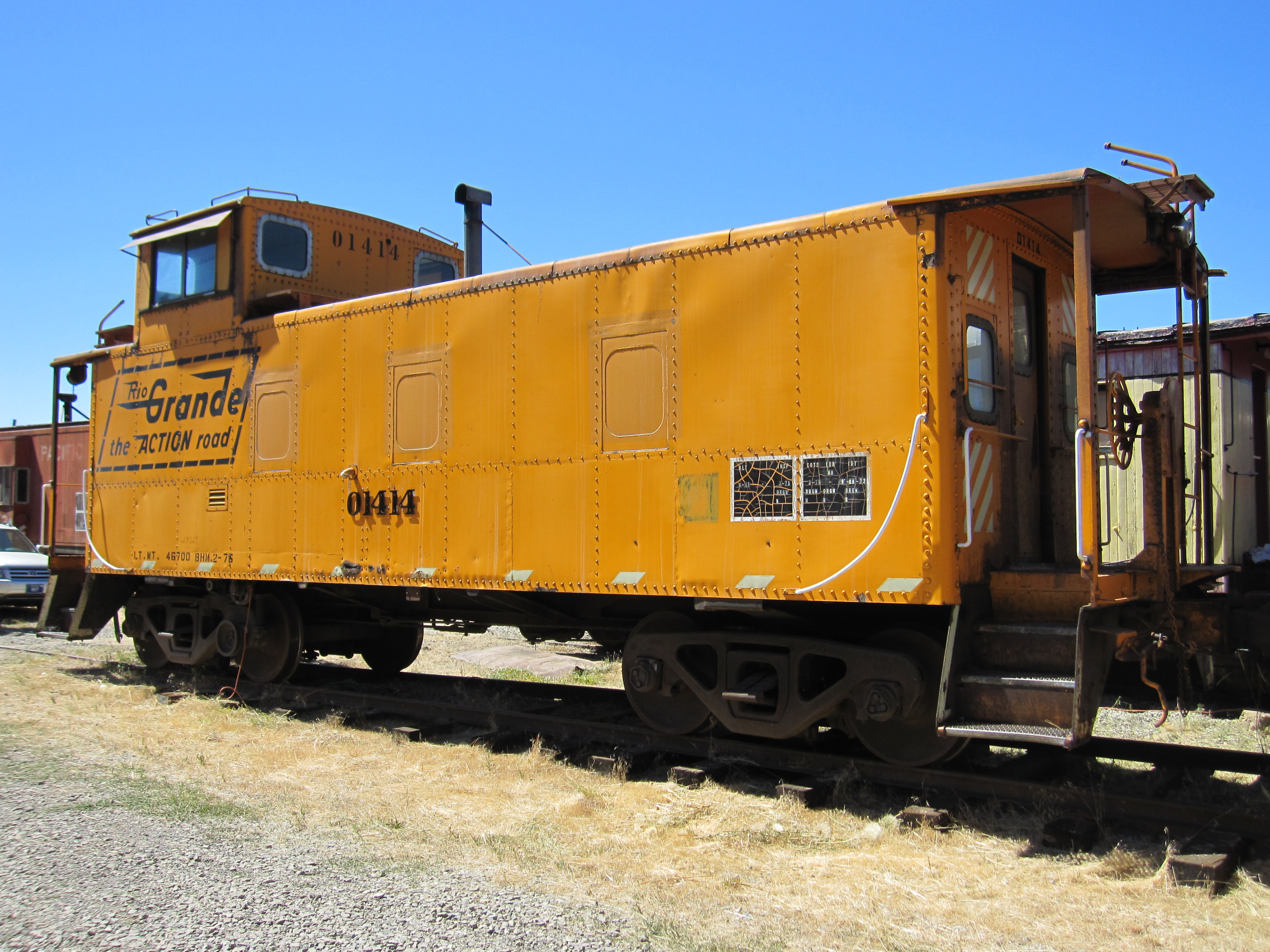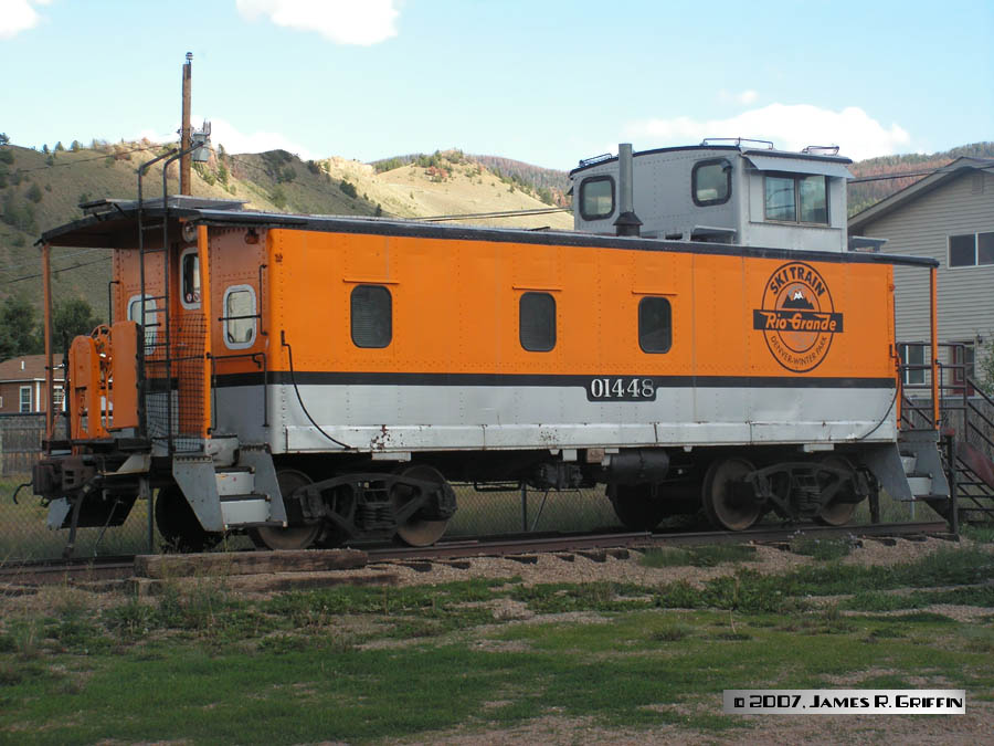 NEW IMAGESCaboose 01448, on display at the museum in Hot Sulphur Springs. This caboose had previously been on display at the Winter Park ski area, as an exhibit for the Ski Train and skiing in general, hence the bogus herald. It was given to the Hot Sulphur Springs museum in 1999, but it still has most of the skiing exhibits inside. The interior had been gutted for the exhibits, so there’s no authentic railroad interior left (including the cupola). We toured it while still at Winter Park; I have video of that experience, as well as stills from this visit at HSS.(Second) The famous raised numerals of Rio Grande steel cabooses, visible in this oblique photo of No. 01448. The cast-iron numerals are mounted on spacers to hold them beyond the car body.(third) The cupola end entry.