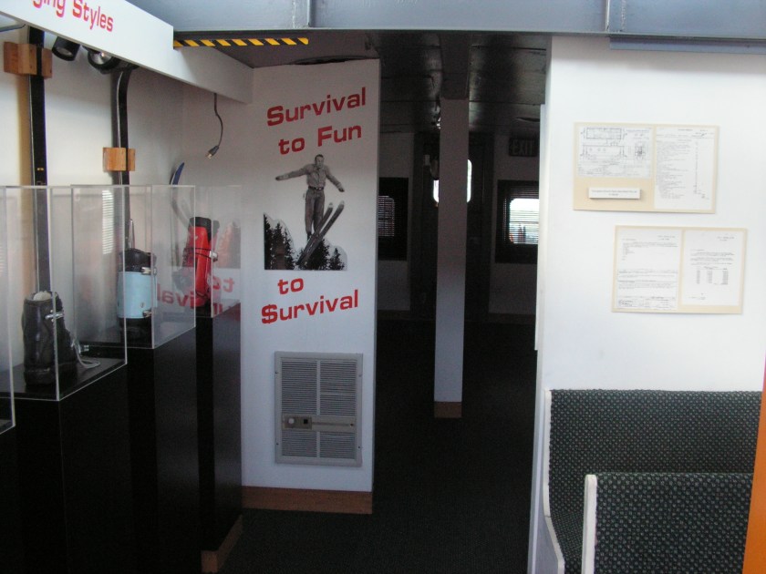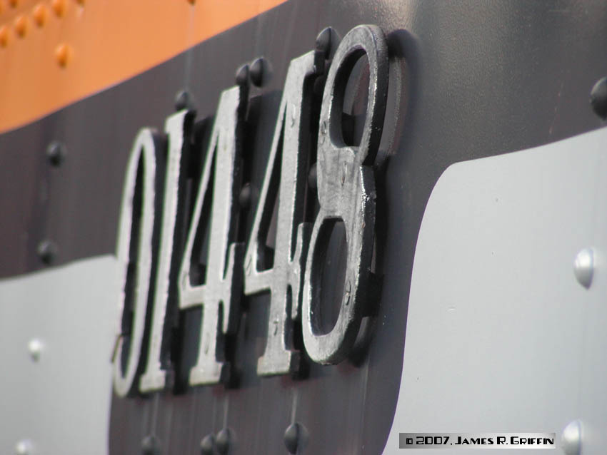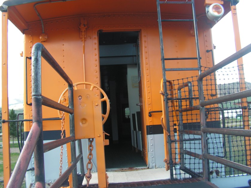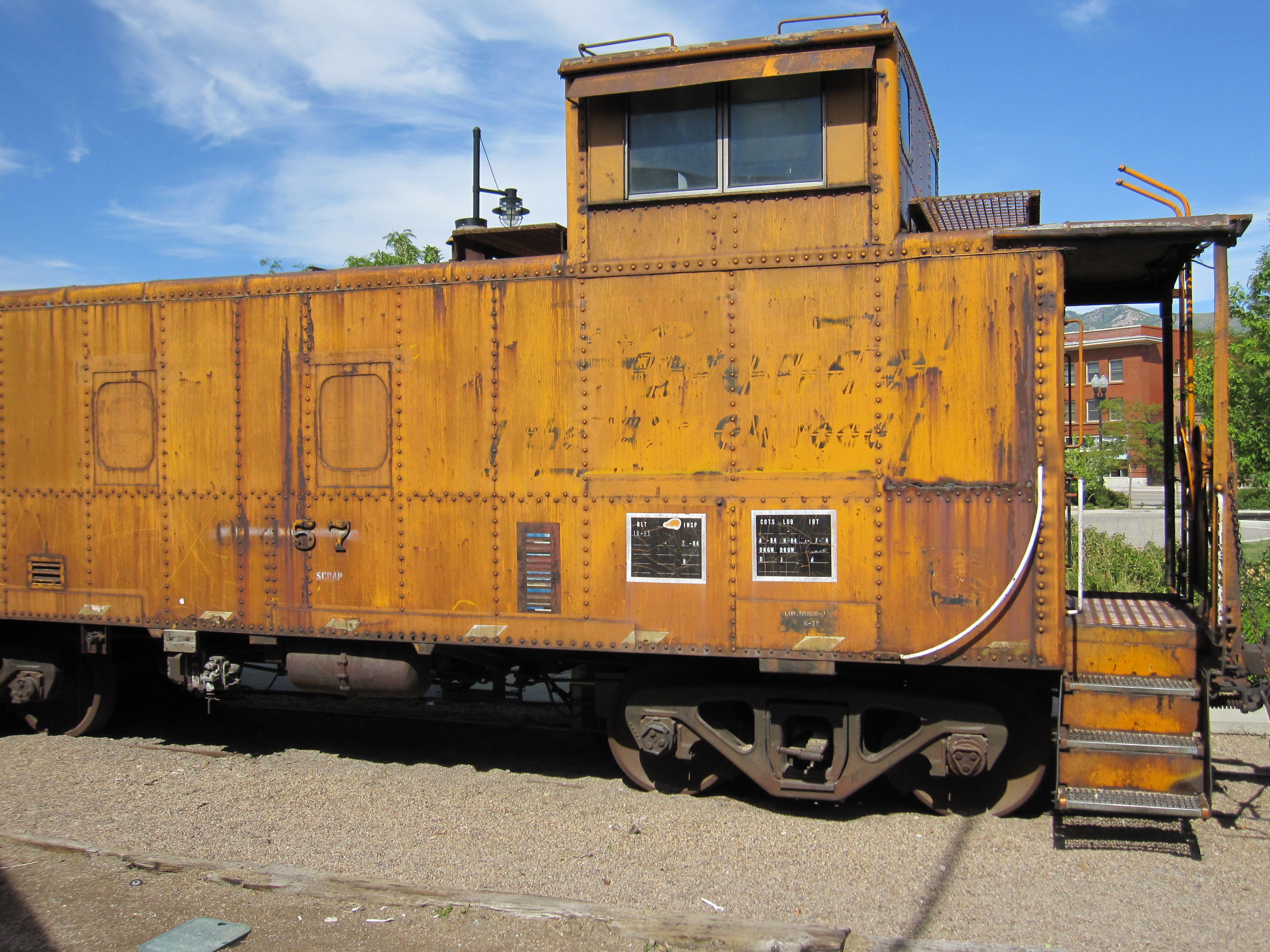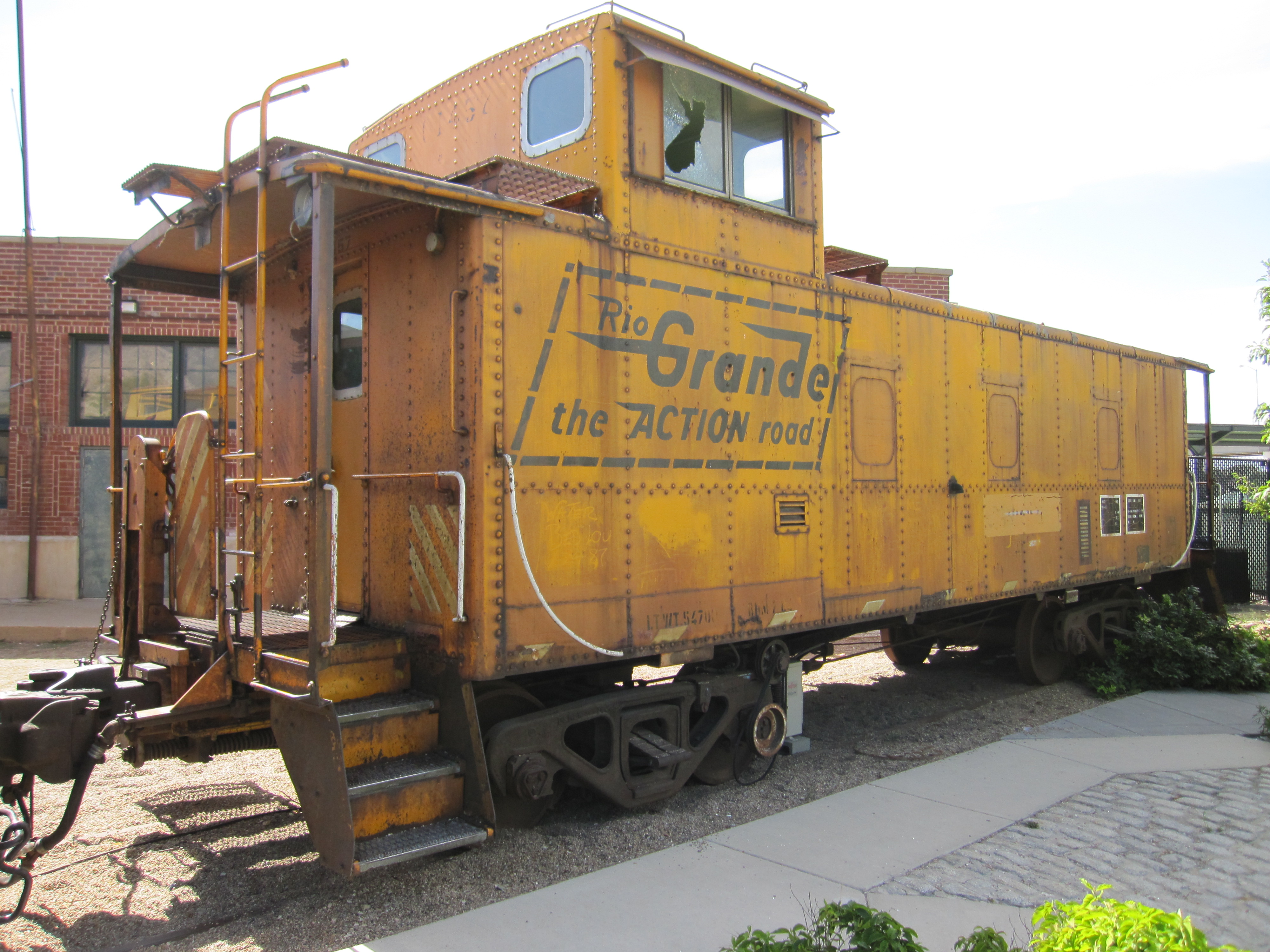 NEW IMAGESCaboose 01448, on display at the museum in Hot Sulphur Springs. This caboose had previously been on display at the Winter Park ski area, as an exhibit for the Ski Train and skiing in general, hence the bogus herald. It was given to the Hot Sulphur Springs museum in 1999, but it still has most of the skiing exhibits inside. The interior had been gutted for the exhibits, so there’s no authentic railroad interior left (including the cupola). We toured it while still at Winter Park; I have video of that experience, as well as stills from this visit at HSS.(Second) The famous raised numerals of Rio Grande steel cabooses, visible in this oblique photo of No. 01448. The cast-iron numerals are mounted on spacers to hold them beyond the car body.(third) The cupola end entry.