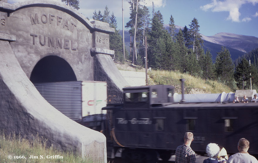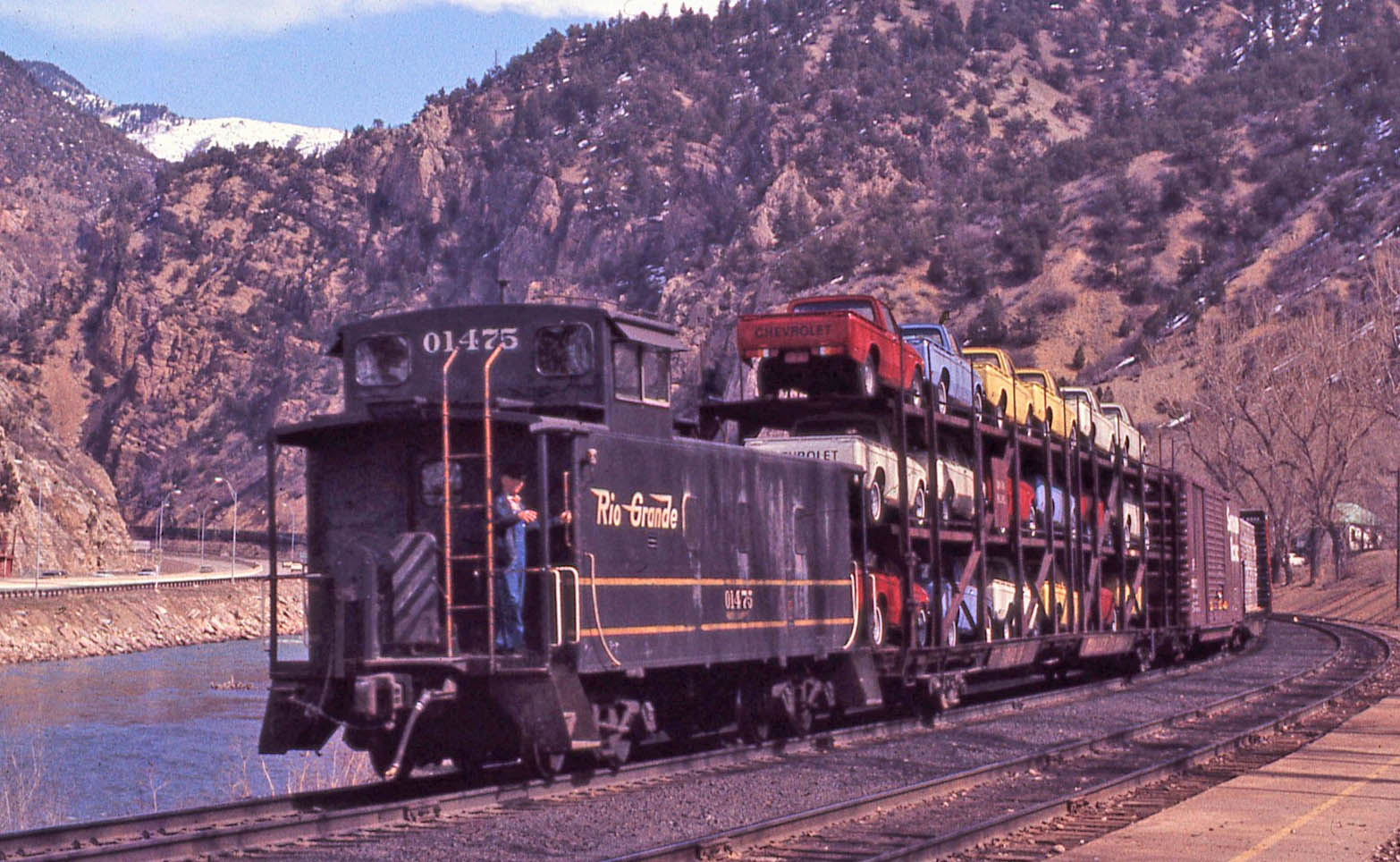 An unidentified caboose but possibly 01485 (it’s one of the welded cars) is trailing on an eastbound train consisting of pigs and autoracks. It’s exiting Gore Canyon on 9/24/1978. Note the one-stripe paint scheme. NEW PHOTO(detail from a larger photo by Ken Albrecht) | ||