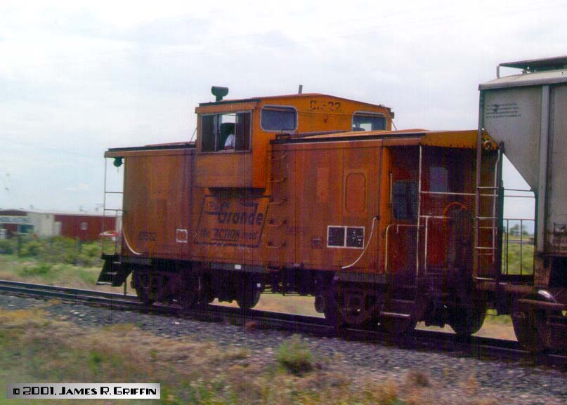 Caboose No. 01489— Feb, 1996, near Ft. Garland, CO, headed east. This hack was built in 1959, the very last of the home-built cabooses to leave the shop. It is of welded construction. Note that the windows have been plated over (circa 1984). Also note that a previous paint job is showing through the peeling paint, revealing two different shades of gold/orange. This caboose originally wore the same scheme as No. 01405 above. It’s now lost its raised numerals. Note the axle generator on the rear truck, inboard axle. Also see the “SOUTH POOL ONLY” stencil. NEW LARGER IMAGE | ||