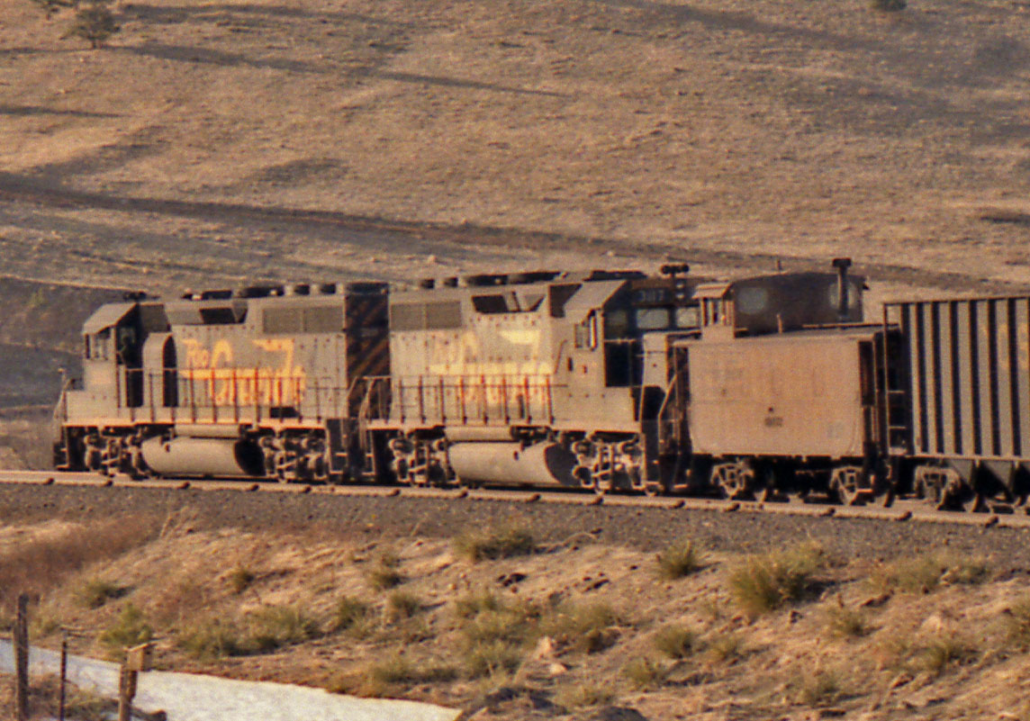 Riveted caboose, possibly 01452 but the fourth digit is only a guess, on 4/08/1984. It was on the tail end of the CSUX coal train coming out of Coal Creek Canyon, with a pair of GP40-2 helpers behind it. Though we can’t quite make the number, you can see:• Raised numerals • Air vent pipe • Toilet vent elbow • Axle generator pulley • Blanked windows, well-fitted • Fully-modernized cupola windows, including the conductor’s elbow in the breeze NEW IMAGE |