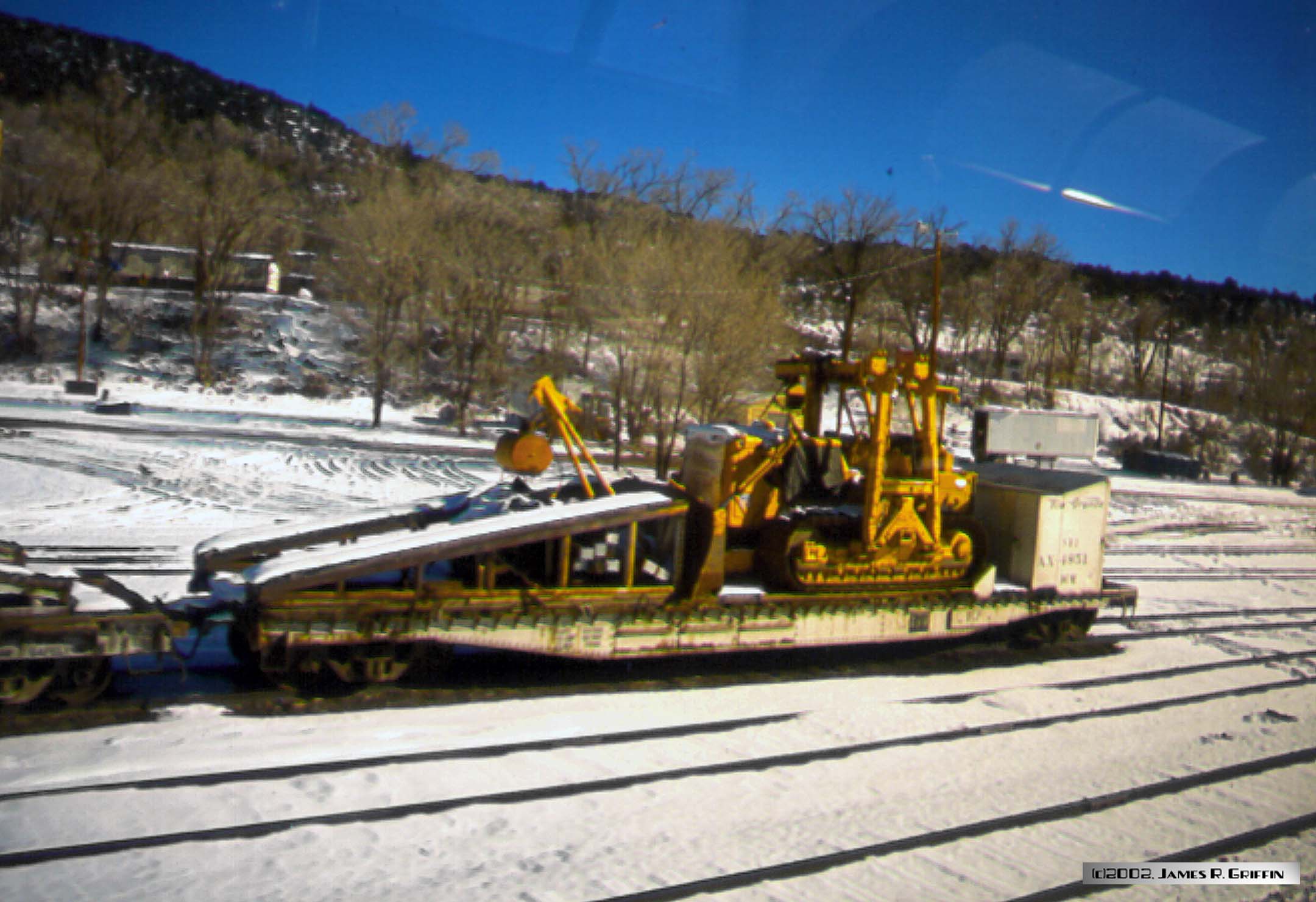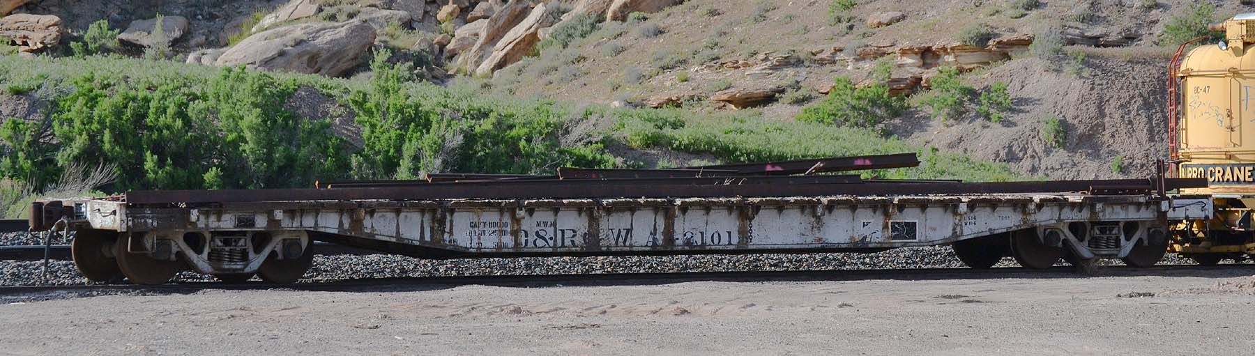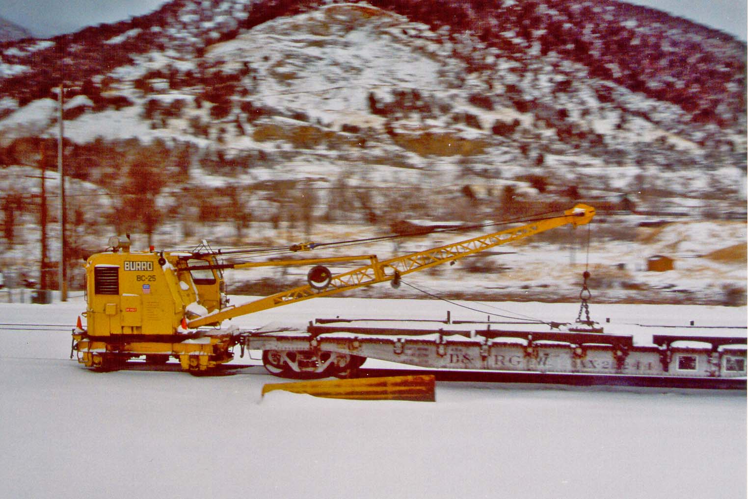 53-foot flatcar No, AX-21015. This car has been in MOW service for a long time, outliving the D&RGW (for whom it’s lettered), the SP, and now soldiers on for Union Pacific. Here it’s spotted on the house track at Westwater, Utah, serving as a combination materials car and boom car for a small Burro crane.