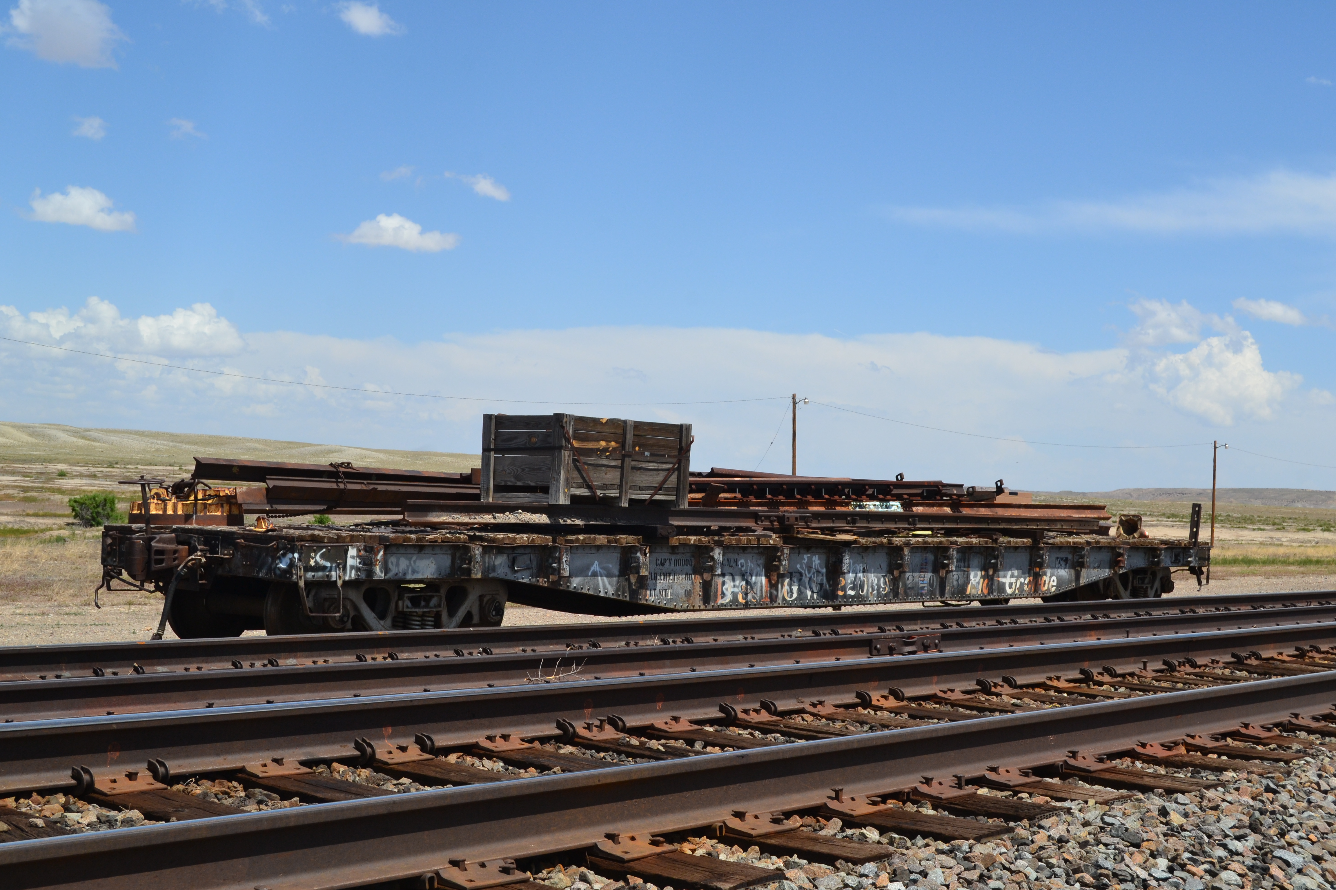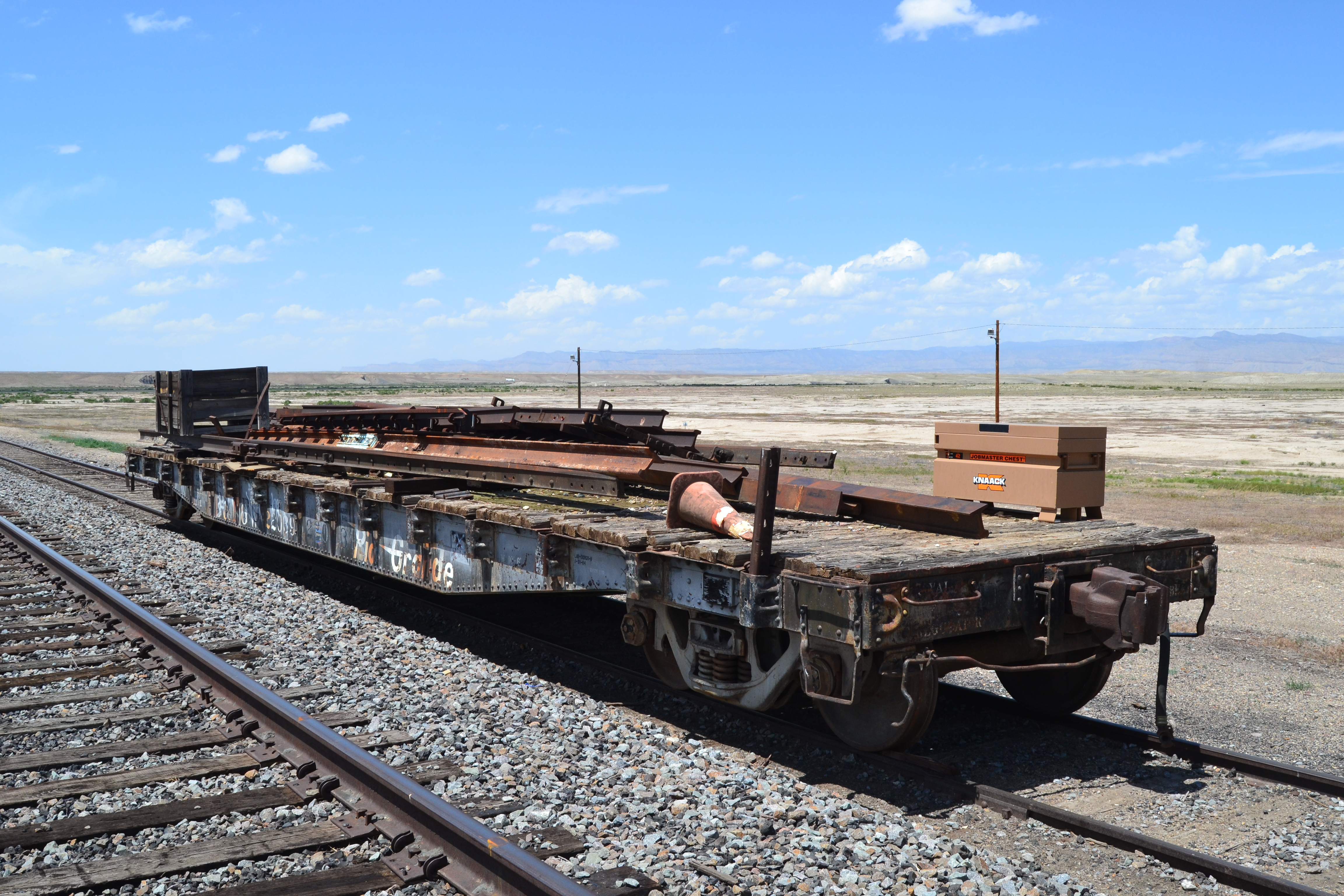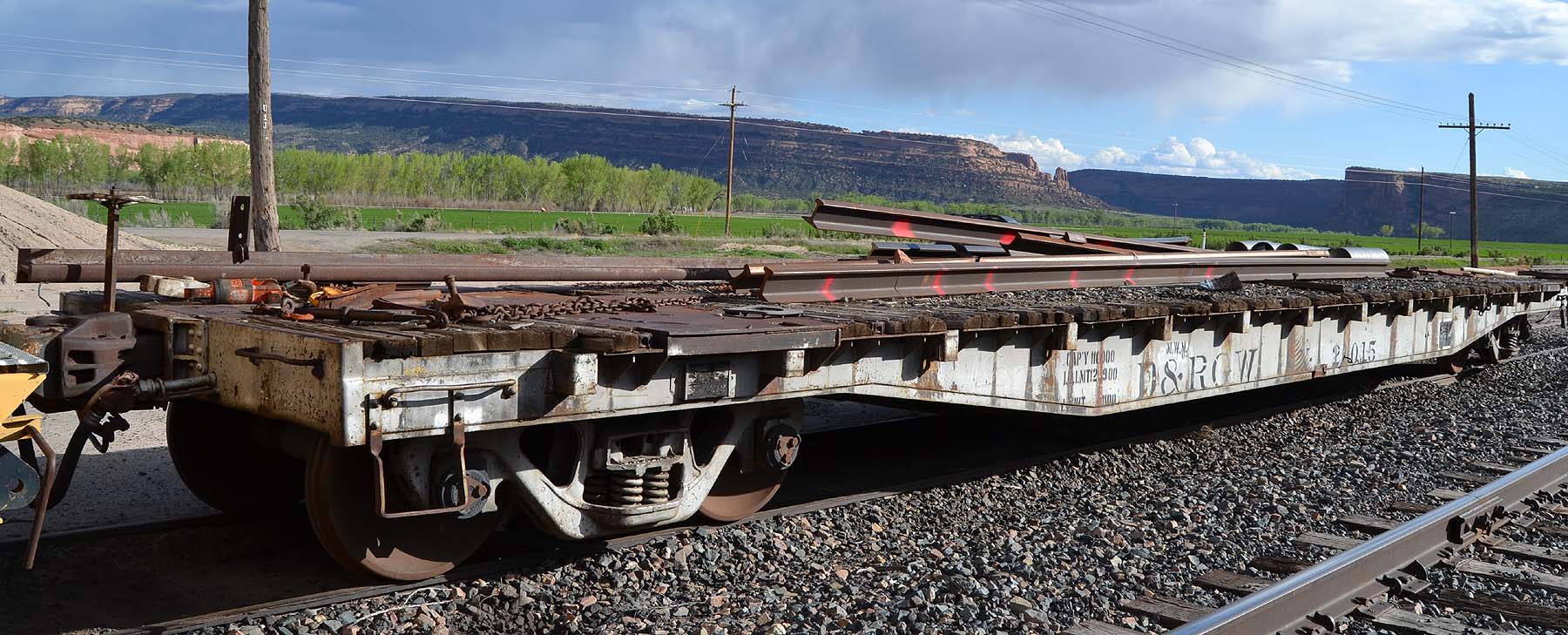 53-foot flatcar No, AX-21015. This car has been in MOW service for a long time, outliving the D&RGW (for whom it’s lettered), the SP, and now soldiers on for Union Pacific. Here it’s spotted on the house track at Westwater, Utah, serving as a combination materials car and boom car for a small Burro crane.