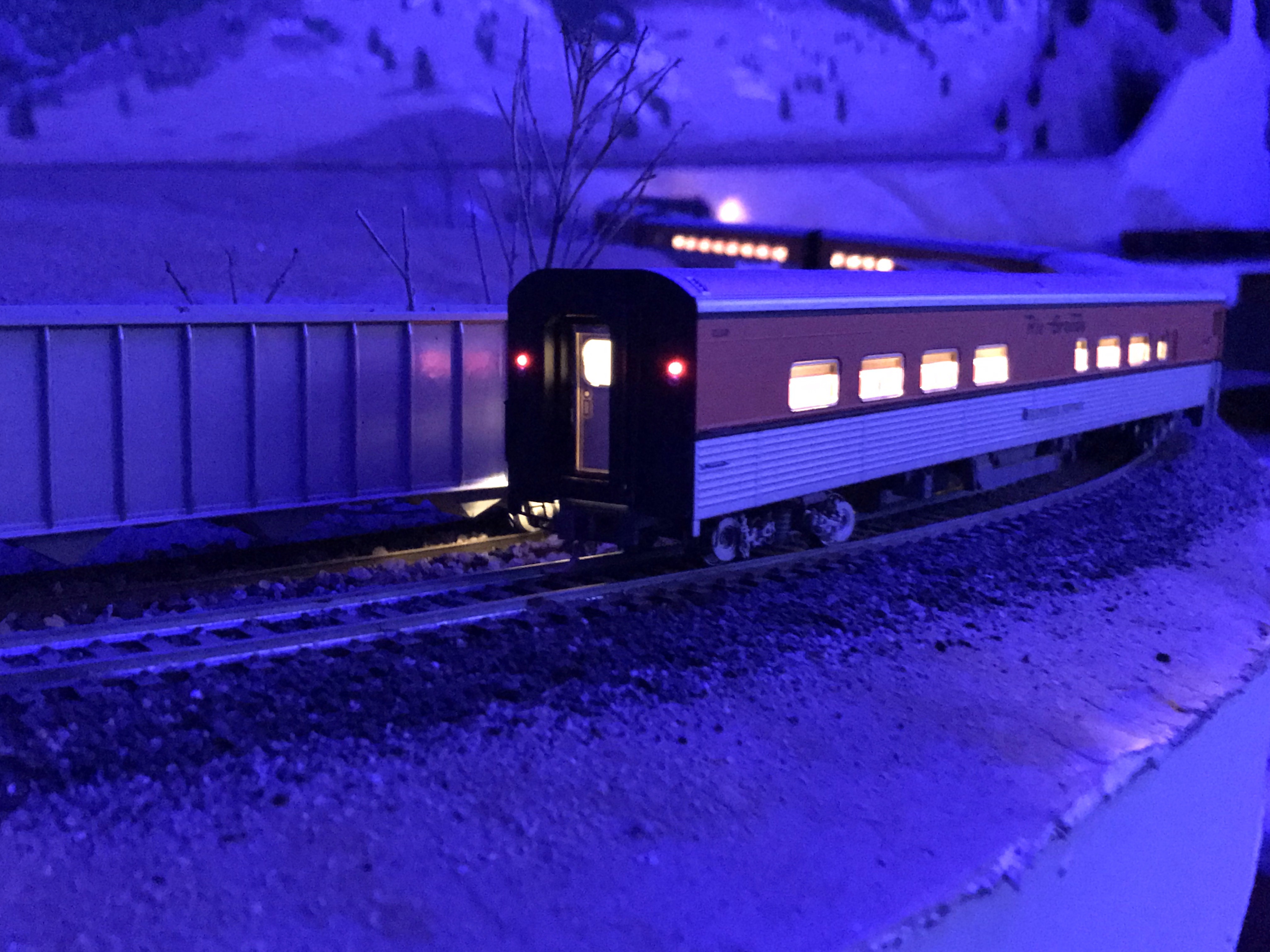 I did end up purchasing four of the Rapido cars. At a distance they’re a pretty good match, and I really like the lighting and marker lights. That means I can do a 9-car Ski Train, which is pretty impressive on a railroad this size.
