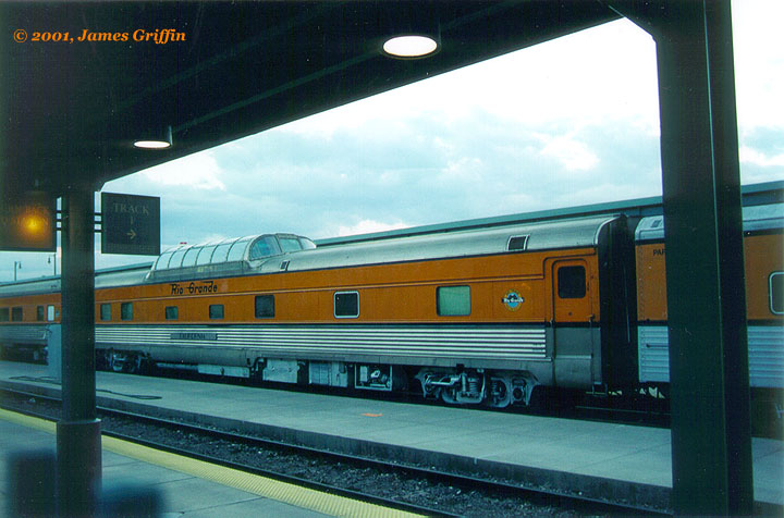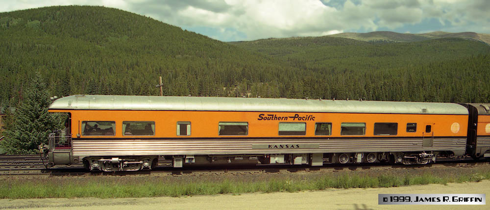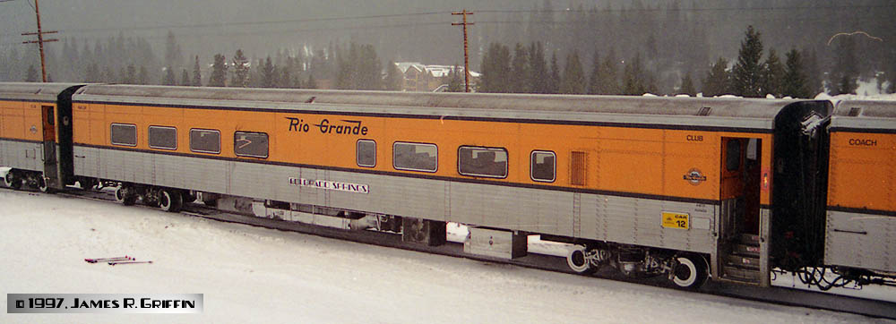 On most runs, the Ski Train had two or three private cars on the end. These could be leased as a set, for up to $8,500 per trip (plus food!). There were two Budd-built cars: one dome/sleeper (ex-SP&S) and one lounge/diner (ex-Rock Island), plus an open-end observation car, formerly Rio Grande’s business car “Wilson McCarthy”, built by Pullman-Standard and modified by the D&RGW in 1950 to receive an open platform. These were also in the Grande Gold-and-Silver. In the early 1990sthey were given a stylized Southern Pacific speed-lettered herald and an SPL emblem by the vestibule doors, which lasted until 1999. At that time the cars were repainted, and they received the Flying Rio Grande herald as well as the standard Ski Train emblem by the vestibules.