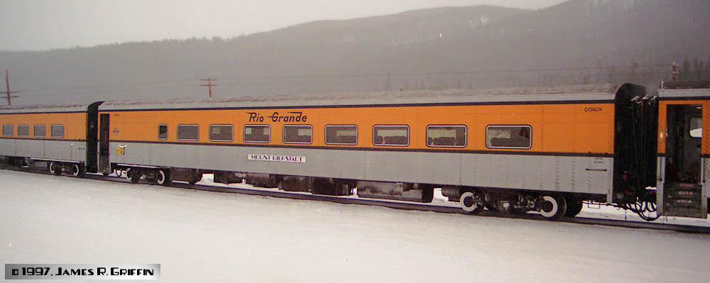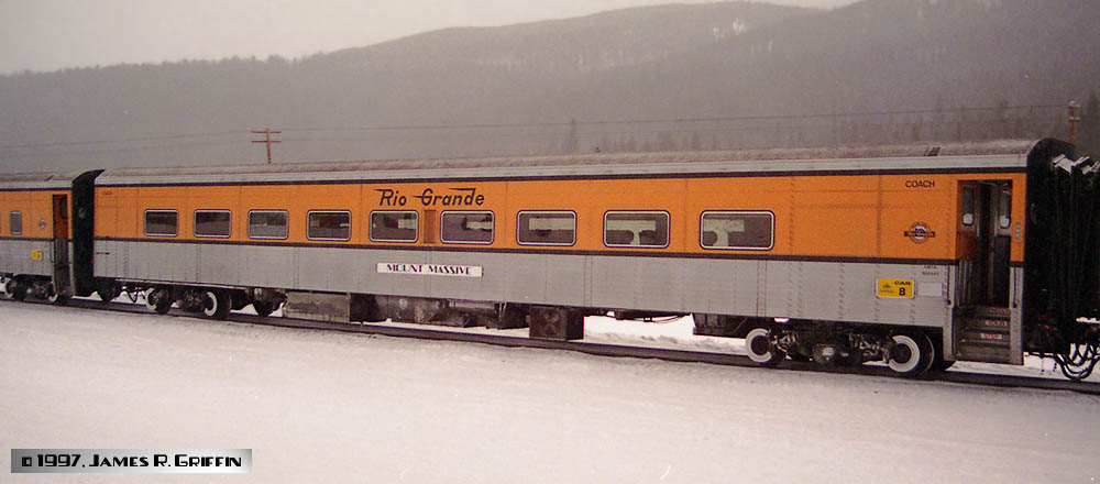Very similar to a coach except that there was a small snack bar area across from the ski racks (vestibule end). The window that is by itself in the photos of LA PLATA PEAK and PYRAMID PEAK below show it. The other two photos show the ski-rack side; note the large windowless area next to the vestibule.