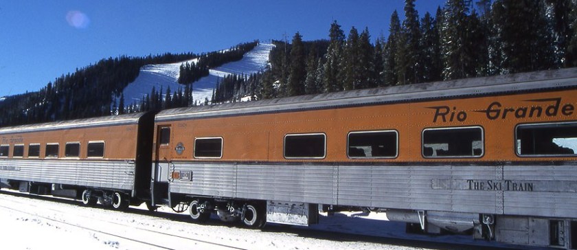 Note: After the 1999 winter season, all the individual car names were removed, and replaced with the words “The Ski Train” in a stylized Roman font. However, in December 1999 the names were put back on the cars, near the vestibules (not on the center nameboards). Additionally, the Rio Grande logo was put back on the private cars, and added to the bicycle car. One other change was to replace the Main Line herald (next to the vestibules) with the Ski Train logo on all cars. Visually, it was nearly identical except for the words at the top of the circle, and for its somewhat larger size.