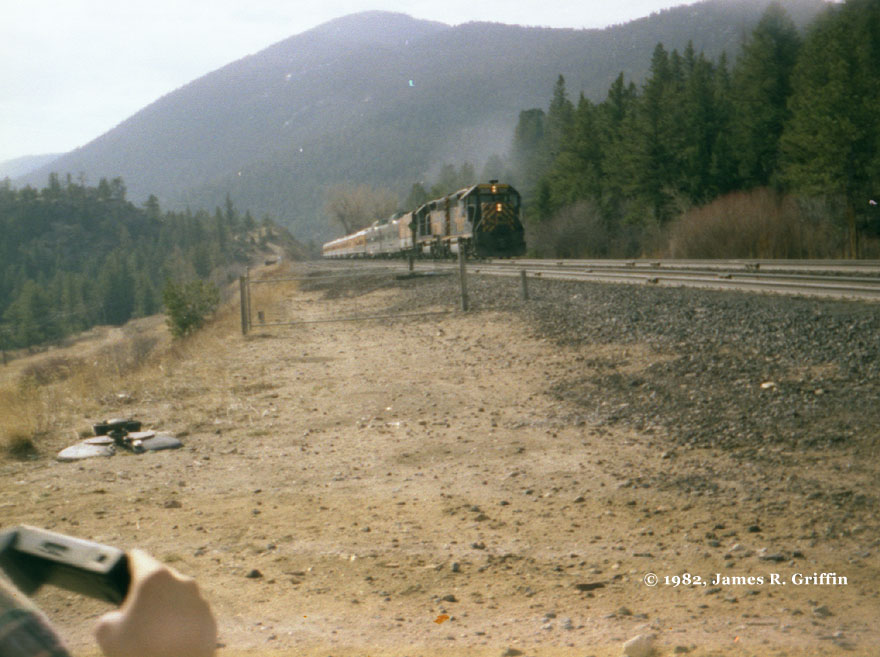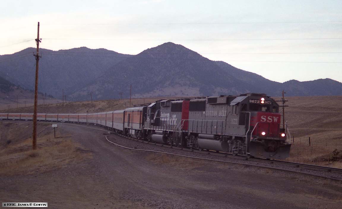 Here, the eastbound Ski Train is passing the east switch of Rocky siding on 2/25/1996, just west of the Highway 93 overpass. During the later Southern Pacific era, SP system power was common, in this case a pair of GP60s. SP 9738 was frequently assigned between 1992 and 1996. |