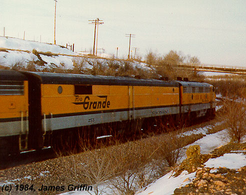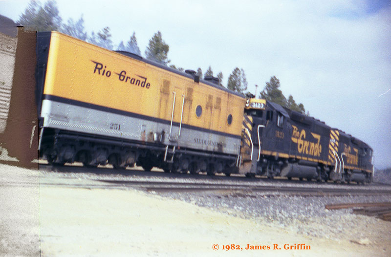 I was fortunate to get to photograph the Ski Train in both of its later incarnations. The first version in question was built around eight old heavyweight coaches picked up by the Rio Grande in 1960. These former Northern Pacific cars were built around 1910 and so were by no means new– especially by the early ’80s when I began photographing them. Up through the 1987 season these cars (plus one of the two Pullman-Standard combines) made up the Ski Train on its weekend runs to Winter Park. The usual power for this train (except for the 1984 season) would be a pair of freight locomotives in the GP40 series, plus a steam generator car, usually No. 251 and later No. 253.