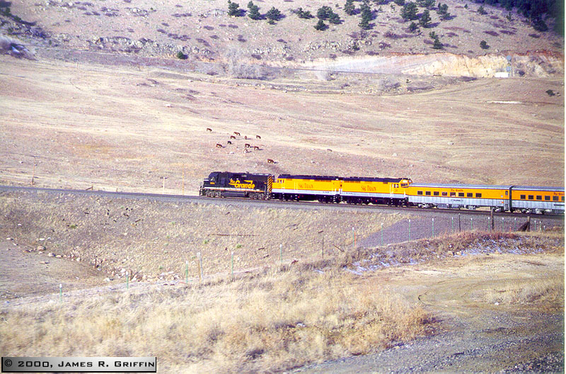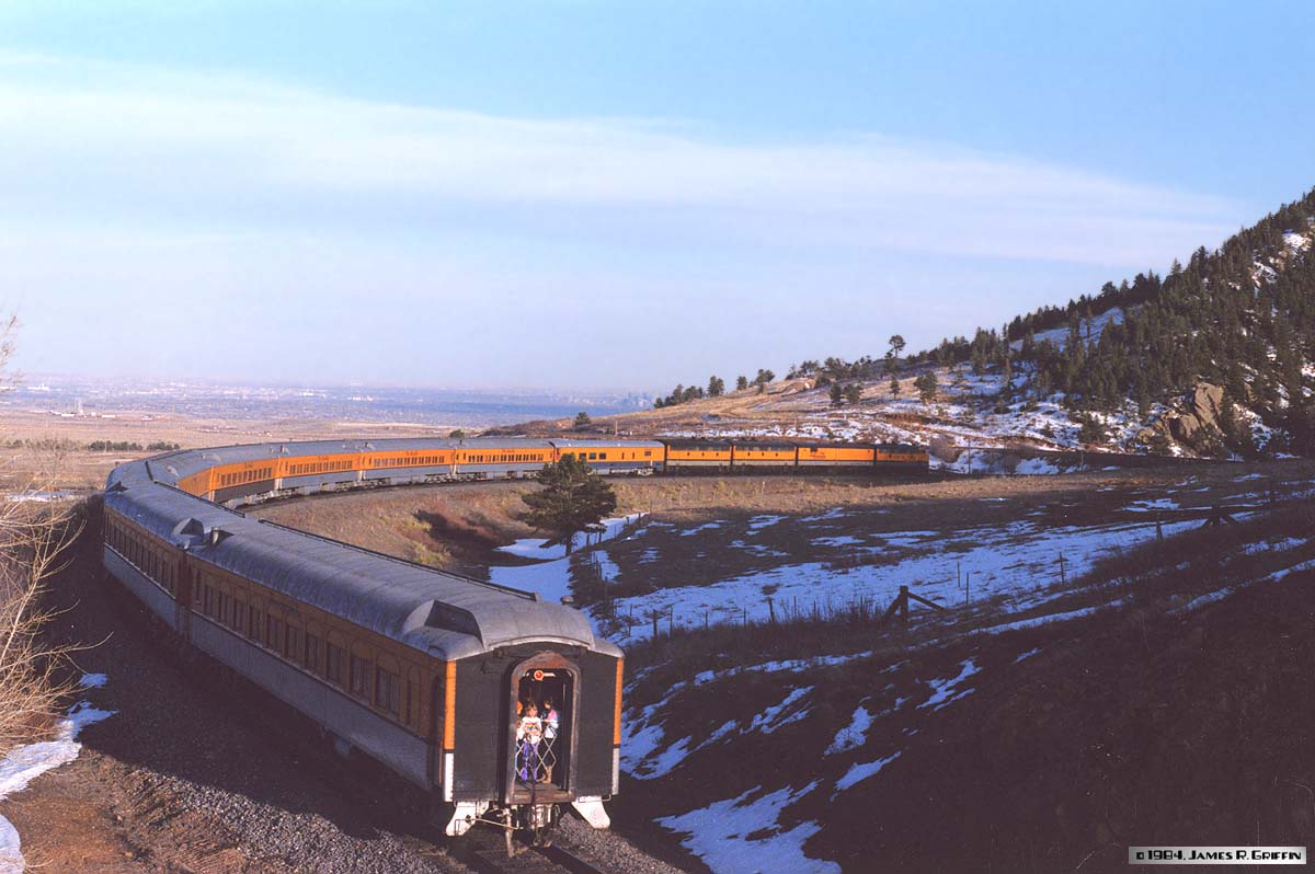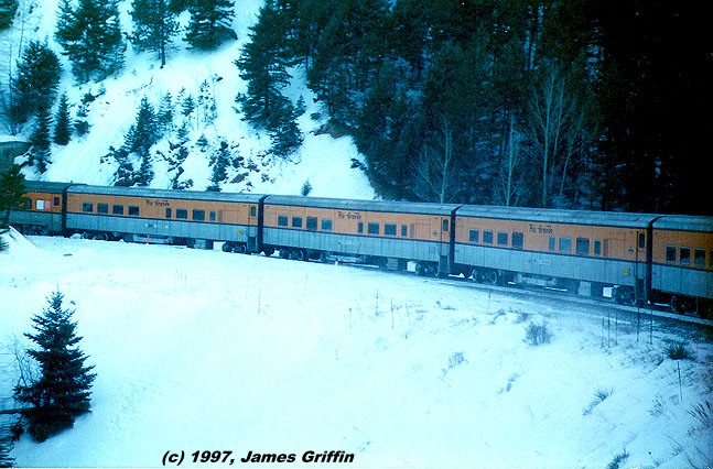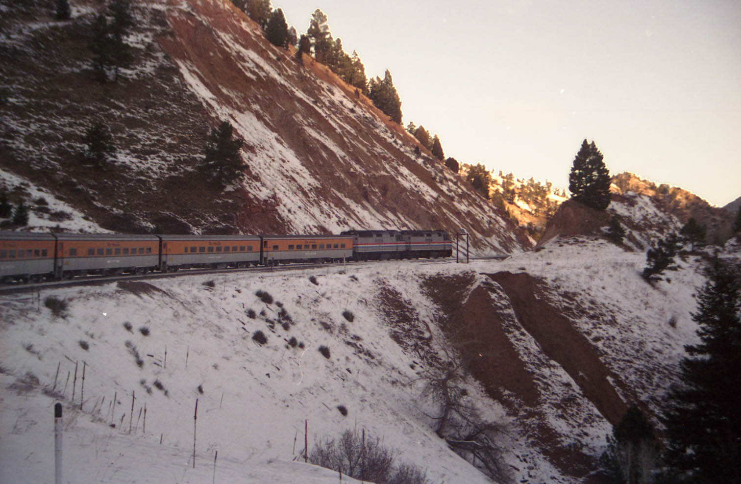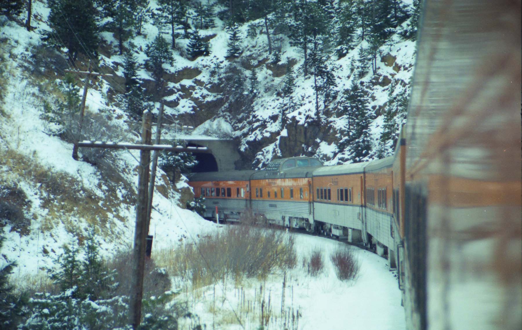 The Club Cars — Exiting tunnel 16 during the westbound climb on 12/28/1997. Tunnel 16 is located at the apex of South Draw, where the railroad folds back on itself while climbing South Boulder canyon. |