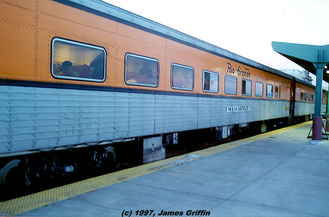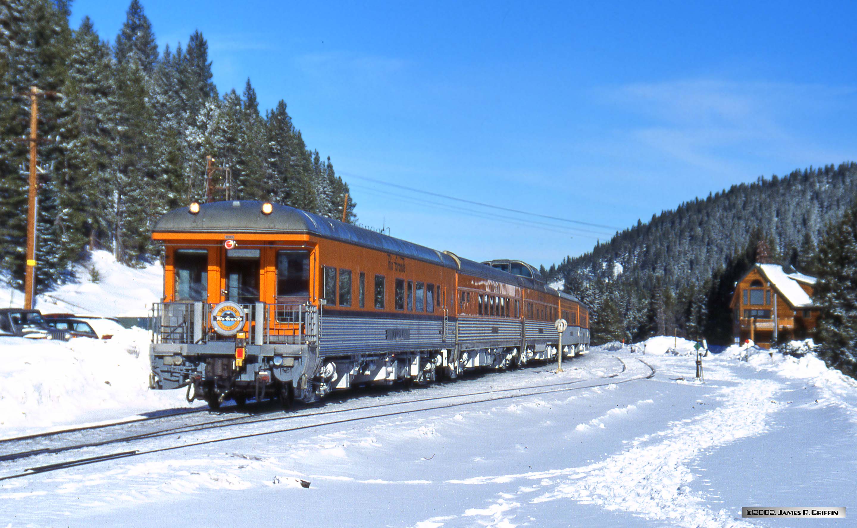 Another view in nearly the same place, 1/29/2000. The private cars were recently repainted and show off their fresh darker orange paint (and the restored “Rio Grande” heralds). |