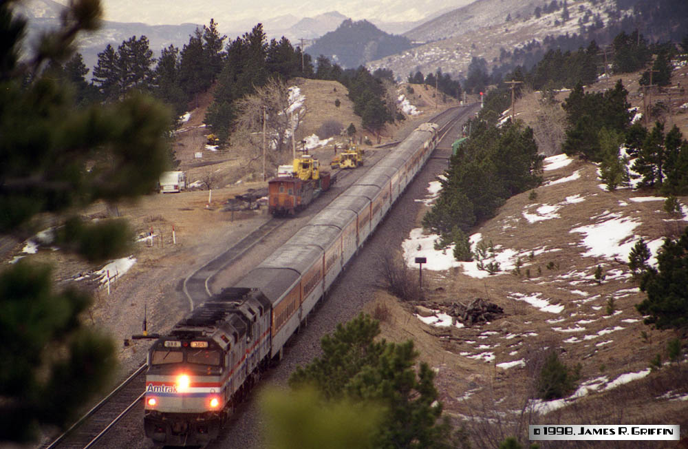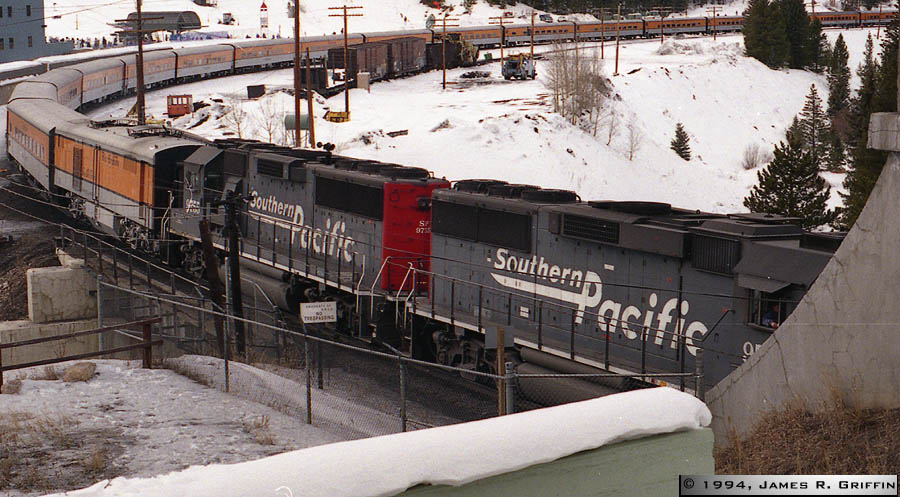 February 20, 1994– the Ski Train is running an hour behind schedule as it enters Tunnel 29. SP No. 8355 (visible) had dropped its load somewhere around Tunnel 13, leaving a lone GP40M for power. The train slowed to a crawl and we limped into Crescent siding to await help. Dispatch radioed a freight waiting up at Pinecliffe, and that train cut off a pair of locos to come to our rescue. As a result, there were four units on the point for the rest of the trip up. Unfortunately I was never able to get a photo of them, but the two loaners were both Espee speed-lettered units, just like No. 8355. |