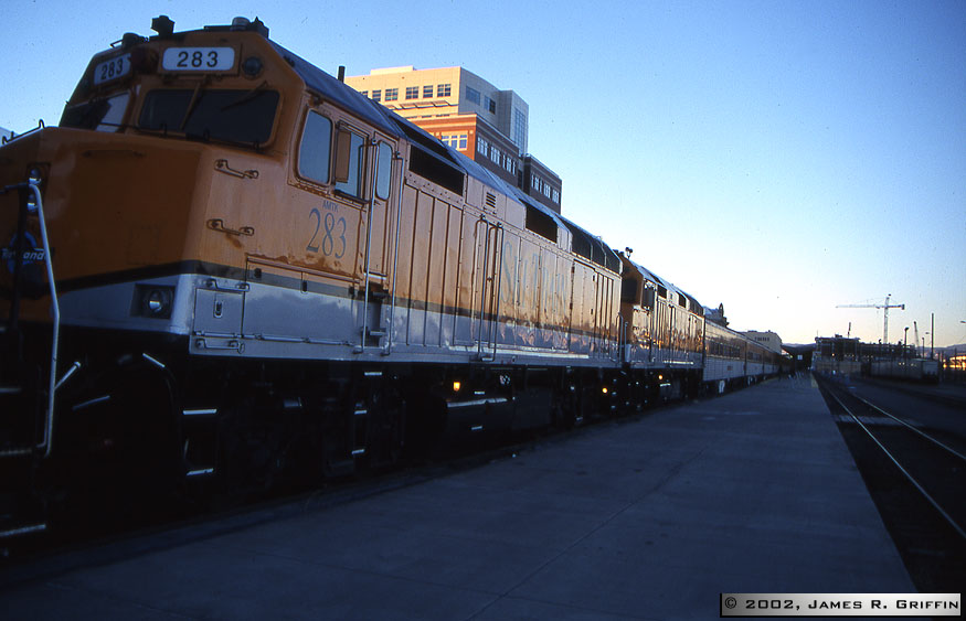 After returning to Denver and unloading its passengers, the Ski Train backs out of Union Station to turn around and be ready for the following day’s run. (12/23/2003)We had actually just arrived on Amtrak 6 and were waiting for the light rail while this activity was going on. |