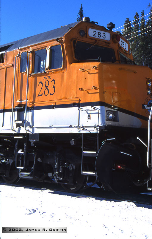 A close-up of the nose of F40PH No. 283. These locomotives kept their original Amtrak numbers. They look really nice in traditional Rio Grande colors. |